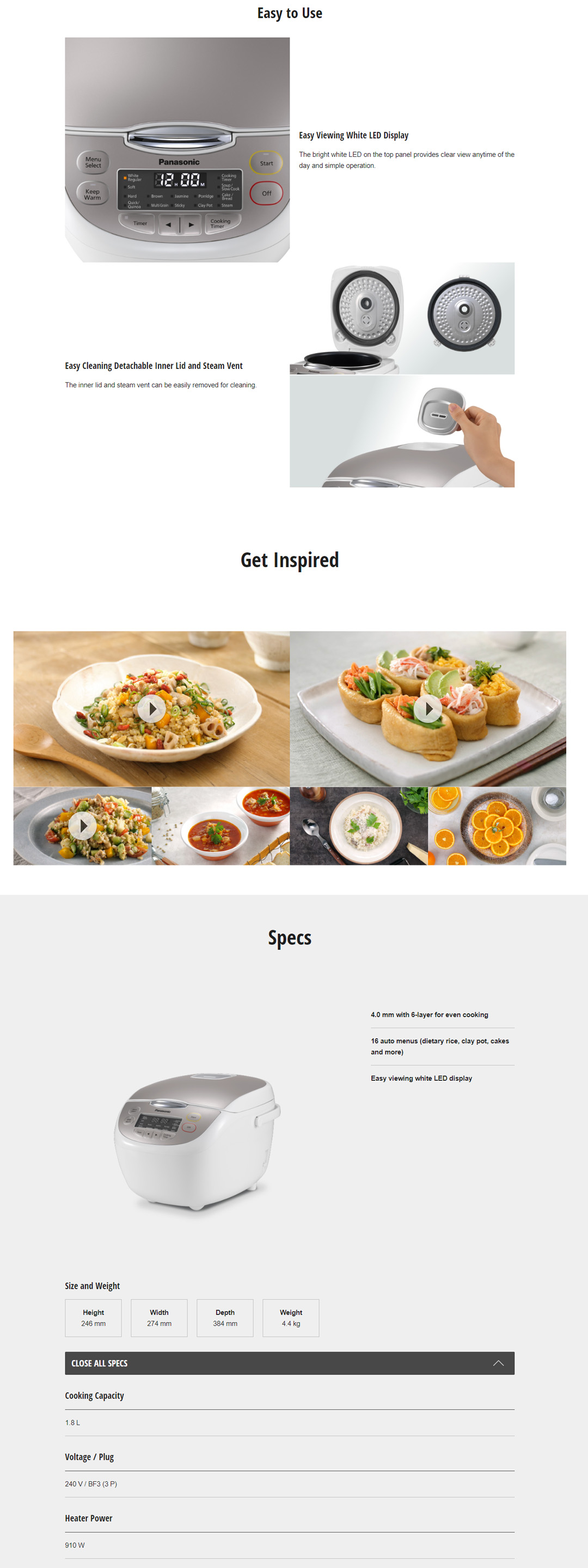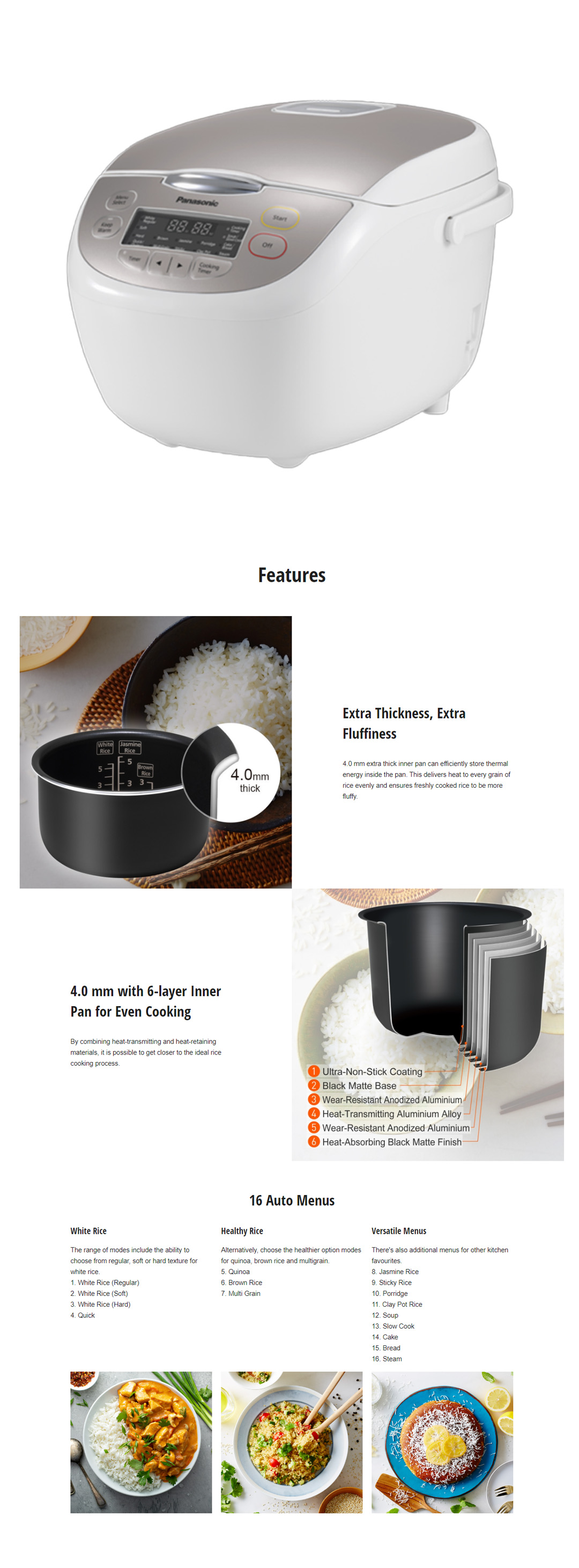 Panasonic 1.8L Microcomputer Jar Rice Cooker SR-CP188NSK | 4.0 mm with 6-layer Inner Pan | 6 Auto Menus | Keep Warm Function | Rice Cooker with 1 Year Warranty
