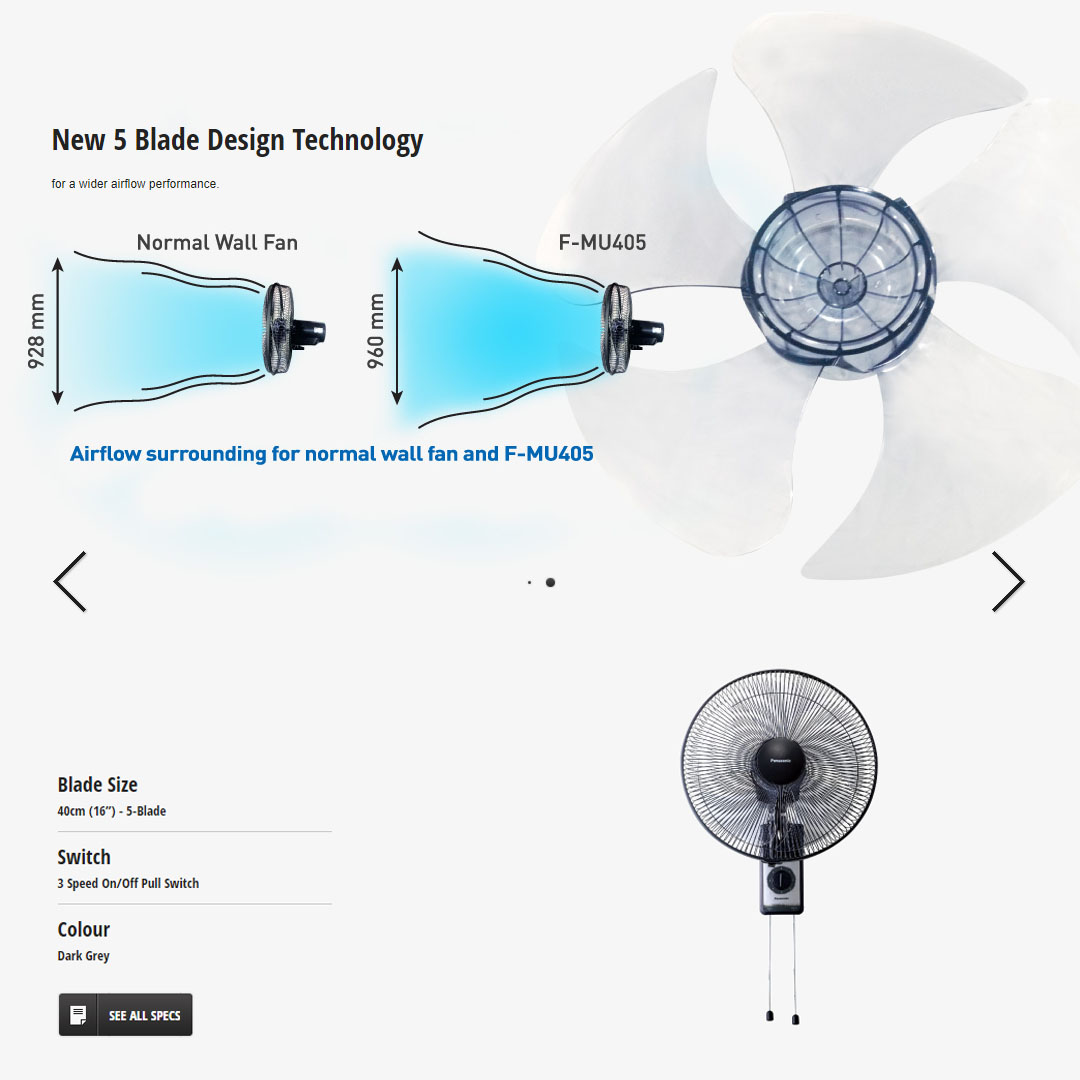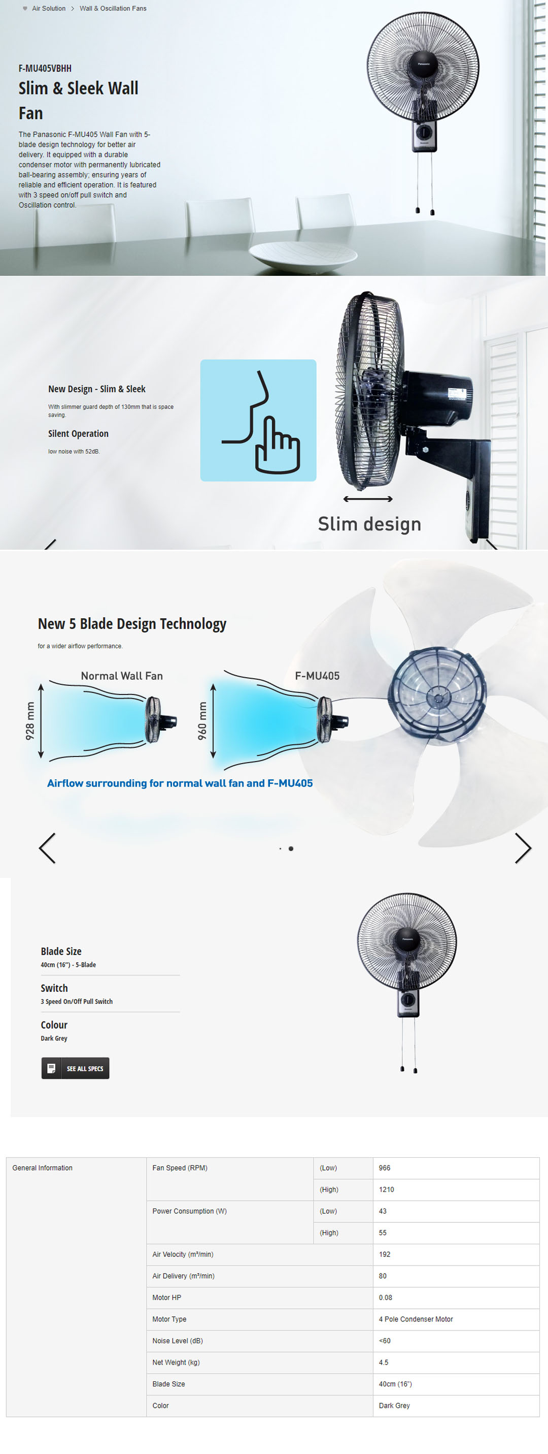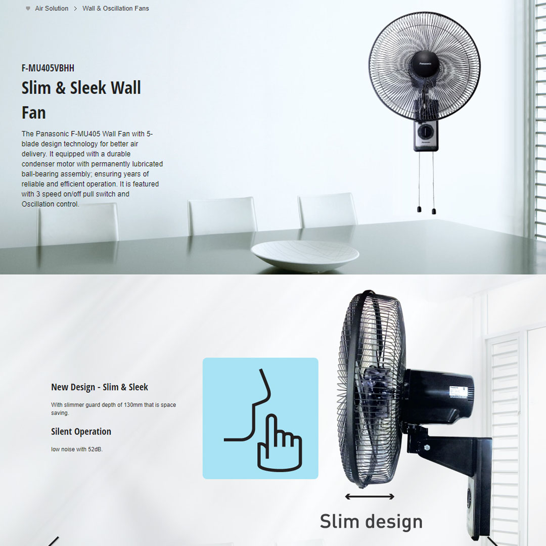 Panasonic 16" Wall Fan F-MU405VBHH-MY | 3-Speed On/Off Pull Switch | Oscillation Control by Pull Switch | Durable Condenser Motor | Thermal Safety Fuse | 5 Fan Blades | Wall Fan with 1 Year Warranty