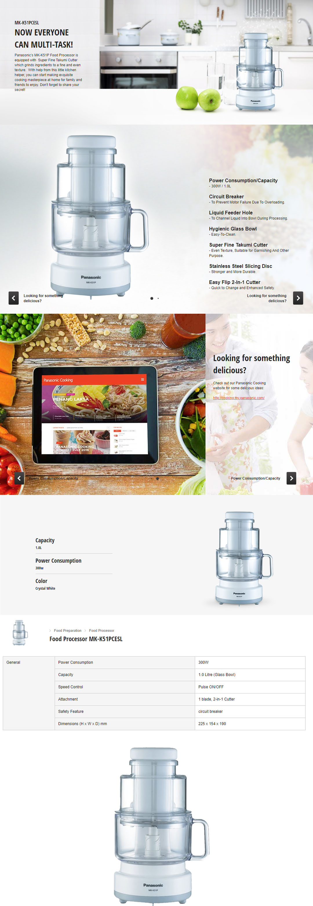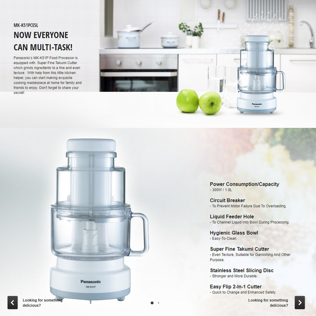 Panasonic 1L Food Processor MK-K51PCESL | Liquid Feeder Hole | Hygienic Glass Bowl | Super Fine Takumi Cutter | Stainless Steel Slicing Disc | Easy Flip 2-in-1 Cutter | Circuit Breaker | Food Processor with 1 Year Warranty