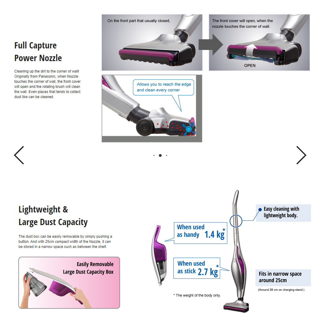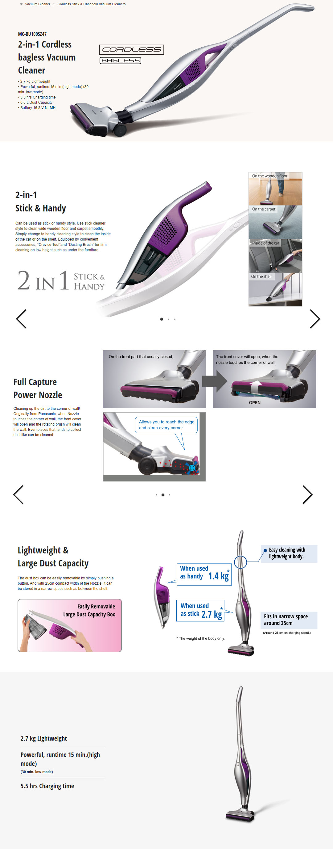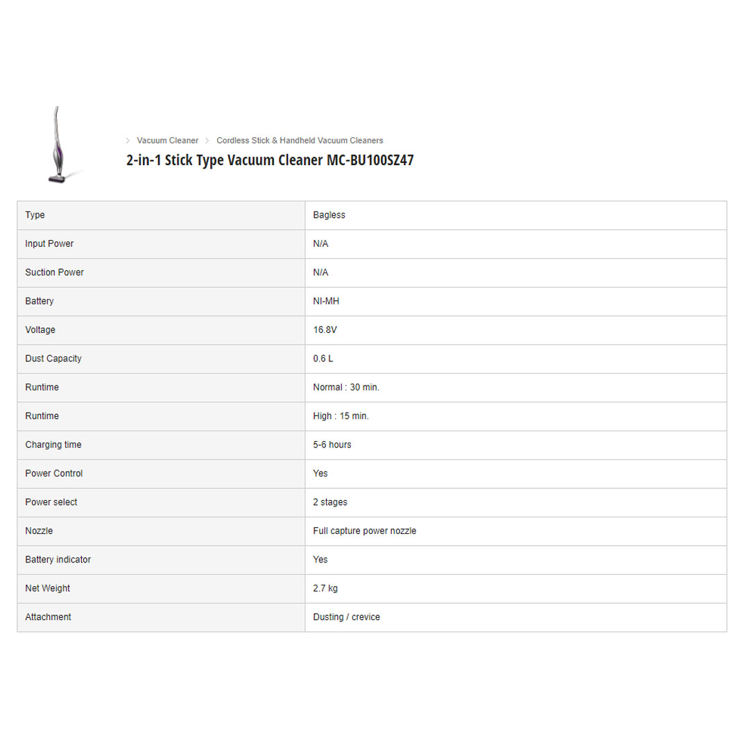 Panasonic 2-in-1 Stick Type Vacuum Cleaner MC-BU100SZ47 | Full Capture power Nozzle | Large Dust Capacity | Power Control | Stick Vacuums with 1 Year Warranty