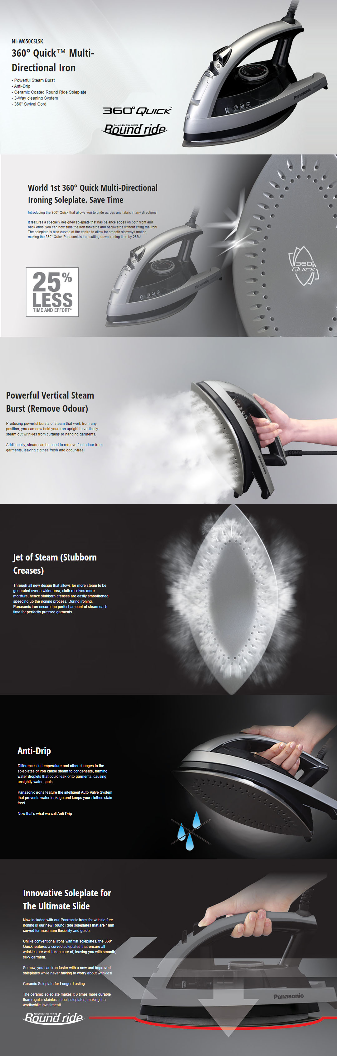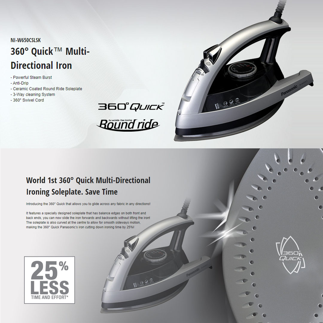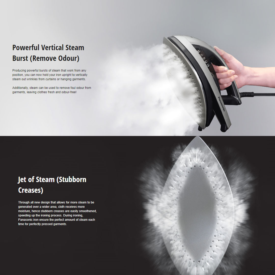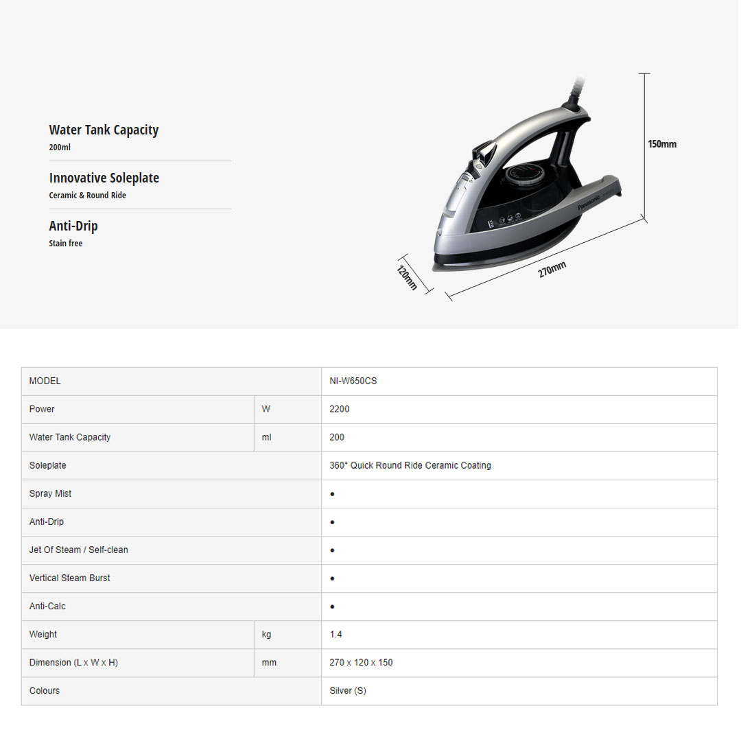Panasonic 2200W Multi-Directional Steam Iron NI-W650CSLSK | Powerful Steam Burst | Anti-Drip | Ceramic Coated Round Ride Soleplate | 60 degree Swivel Cord |