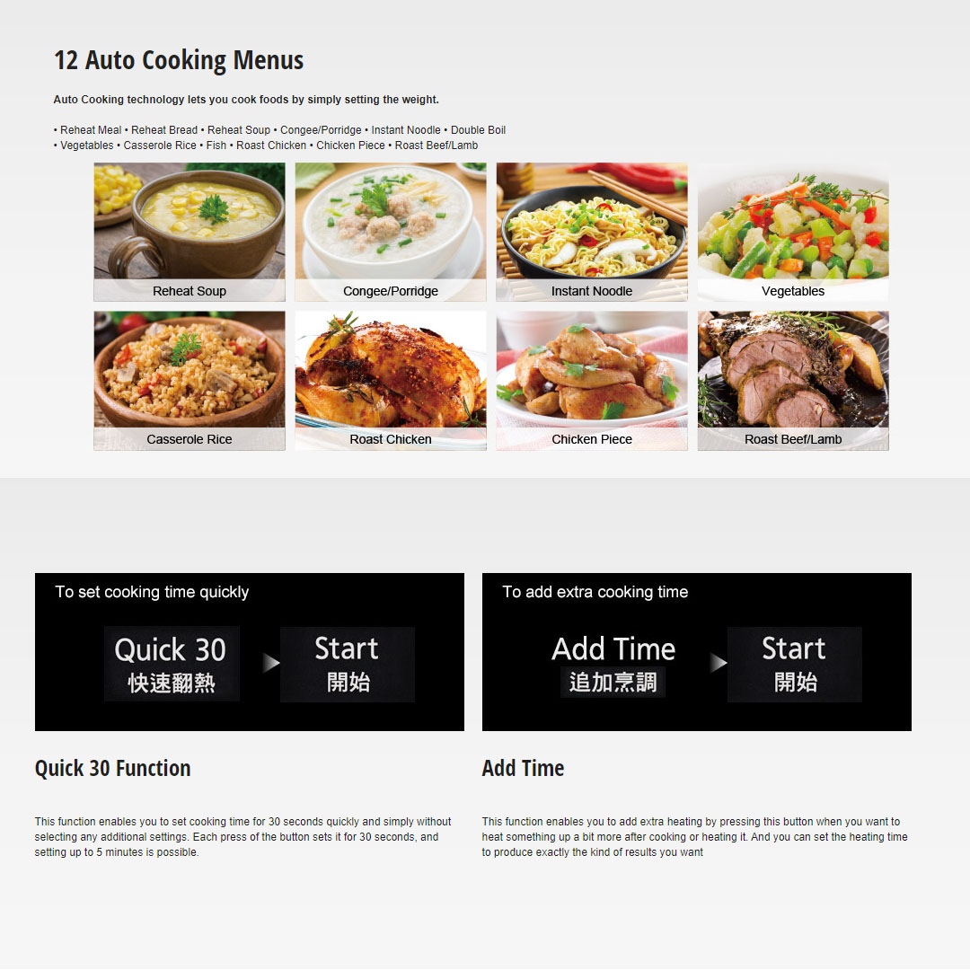 ● Dual Cooking ● Grill Function Available ● Quick 30 Function ● Add Time