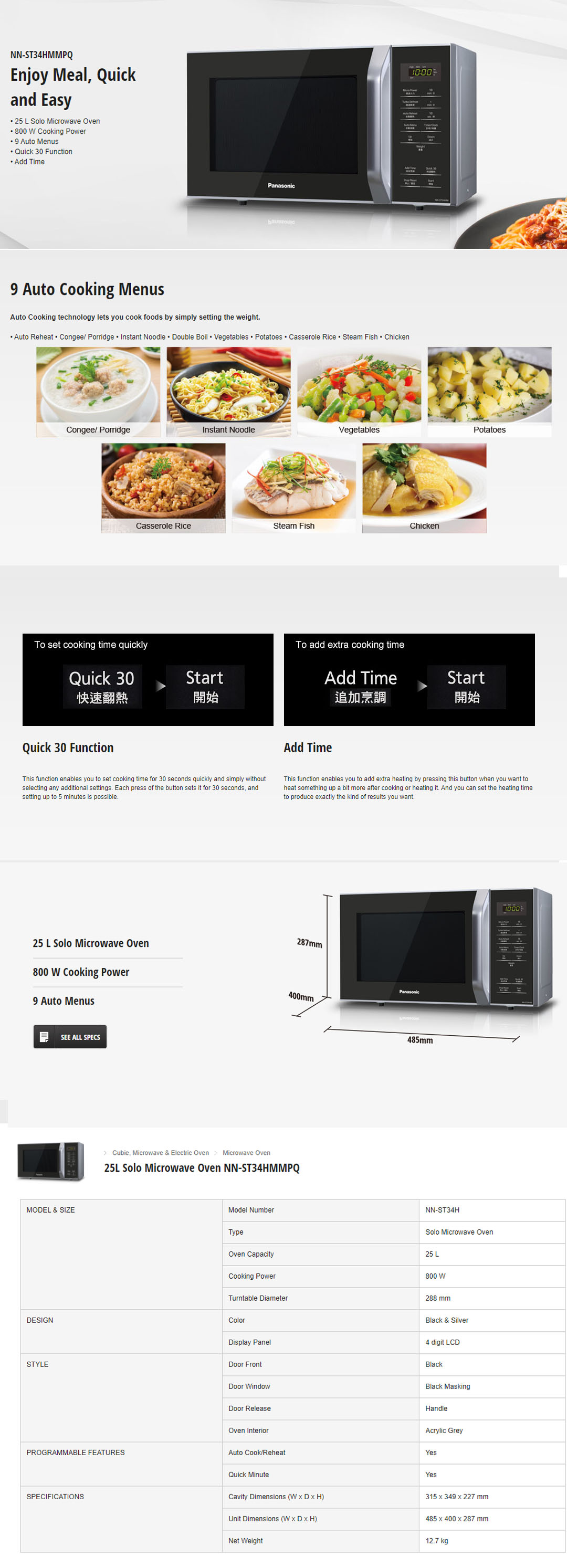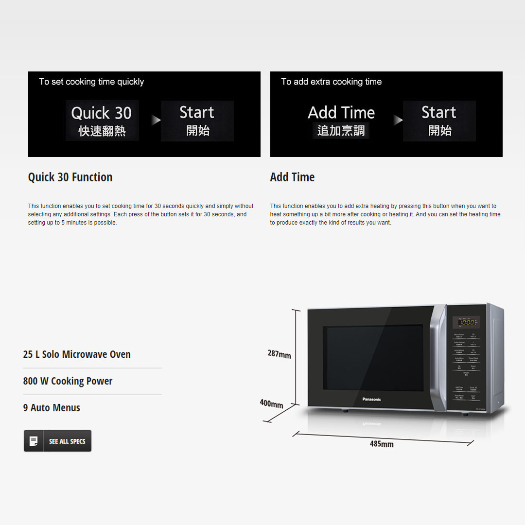 ● 800W Cooking Power ● 9 Auto Menus ● Quick 30 Function ● Add Time