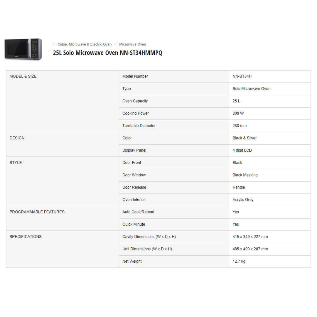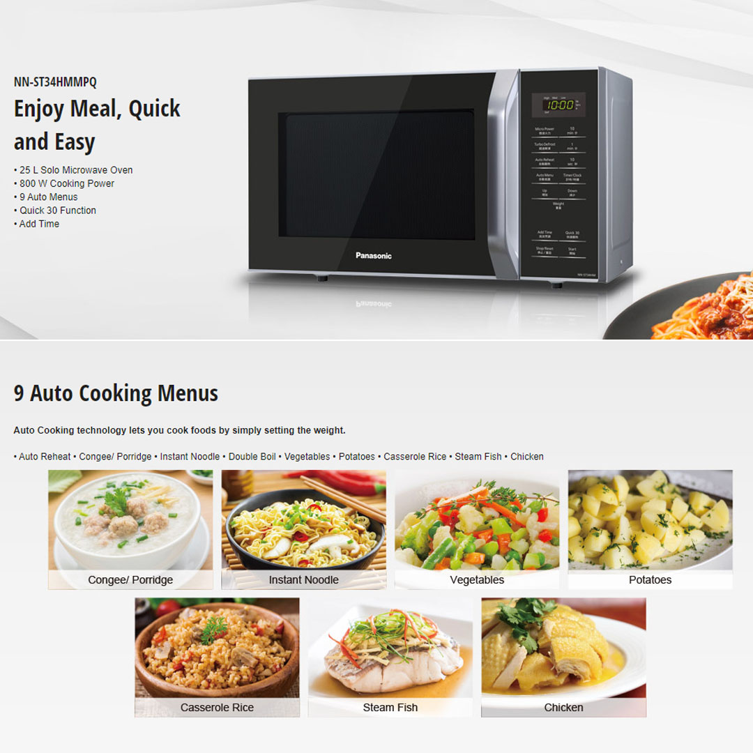 Panasonic 25L Solo Microwave Oven NN-ST34HMMPQ | 9 Auto Menus | Handle Door Release | Reheat | Microwave Oven with 1 YearWarranty