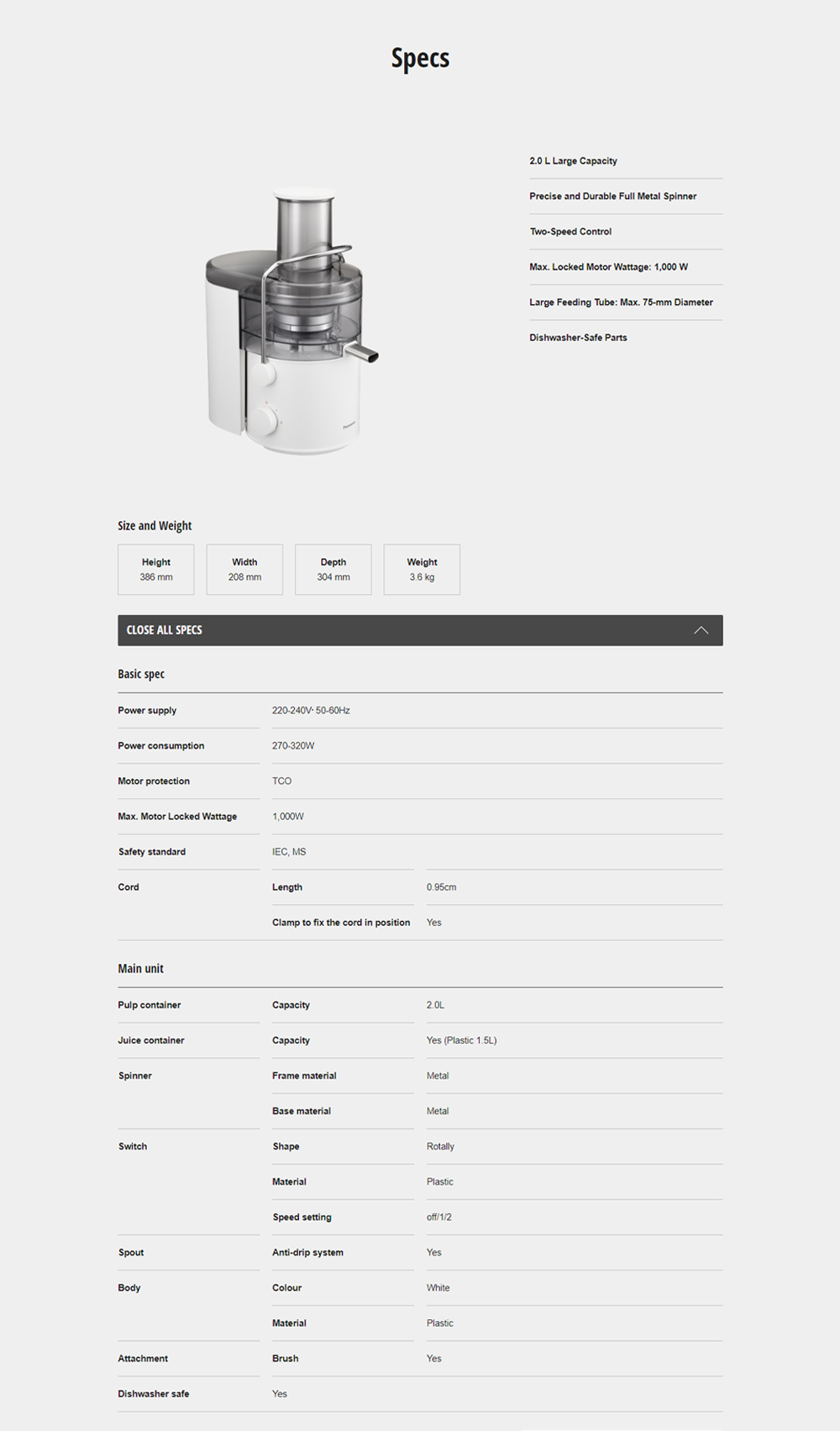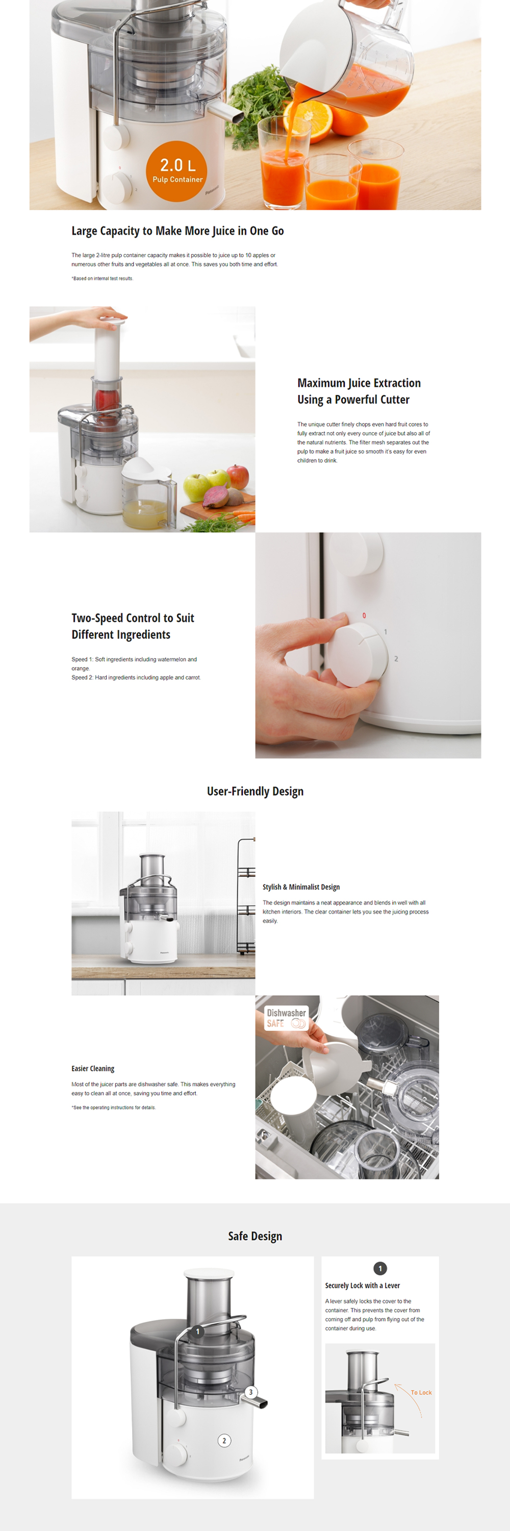 Panasonic 2L Large-Capacity Juicer MJ-CB100WSK | Two-Speed Control | Dishwasher-Safe Parts | Full Metal Spinner