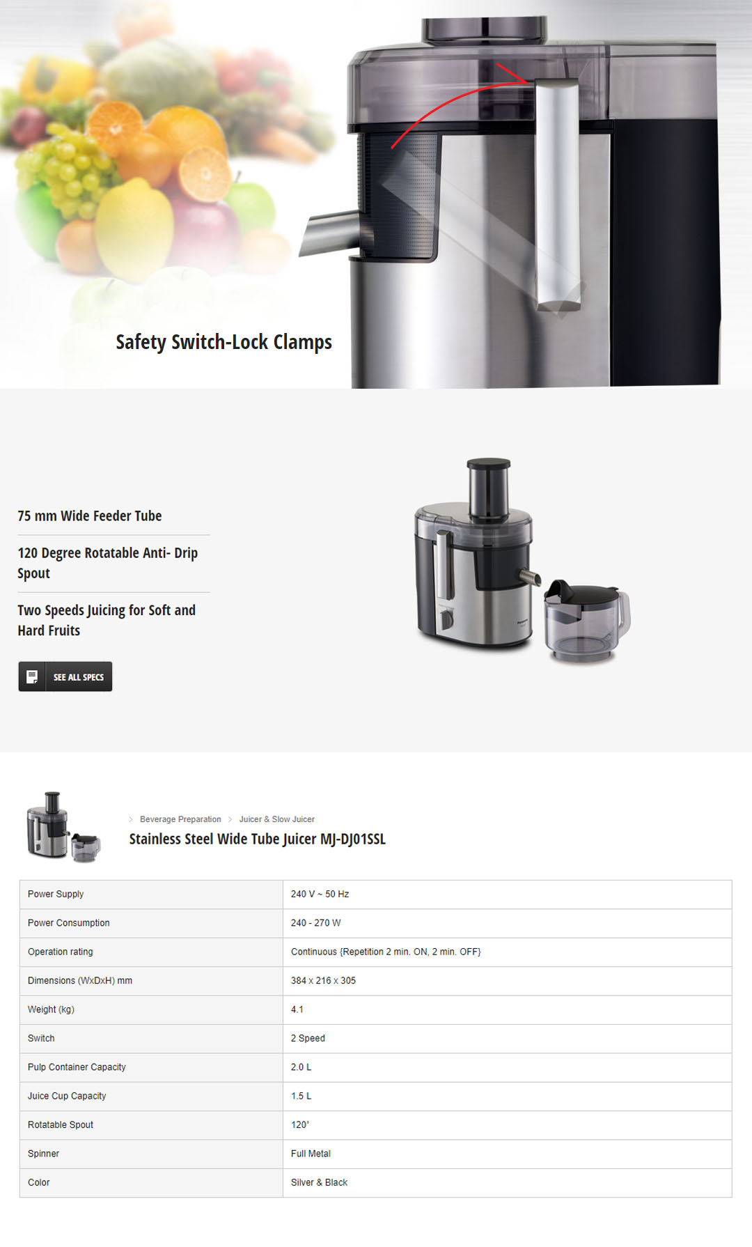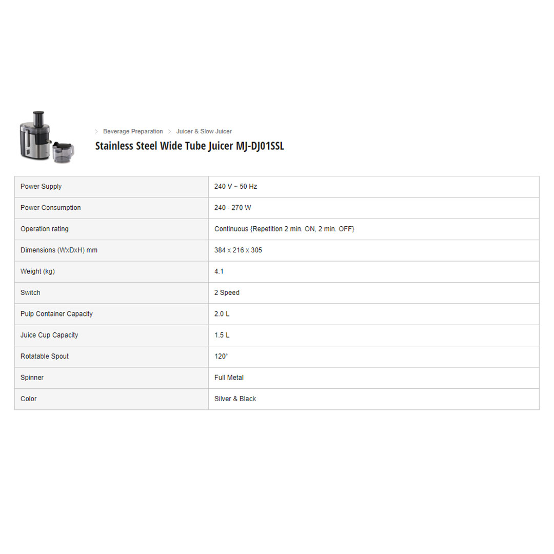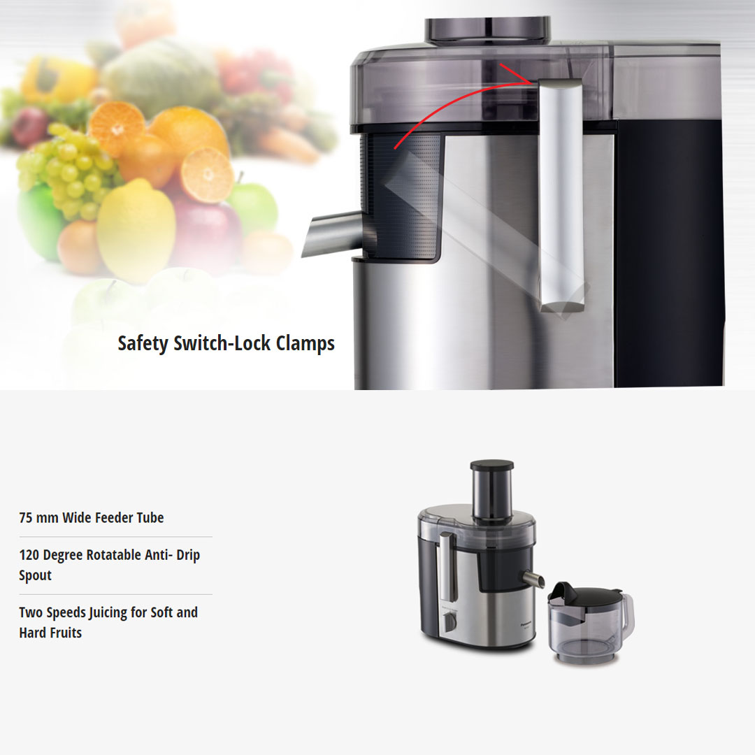 Panasonic 2L Stainless Steel Wide Tube Juicer MJ-DJ01SSL | Two Speed Control | Safety Switch Lock Clamps | Juice Extractor with 1 Year Warranty