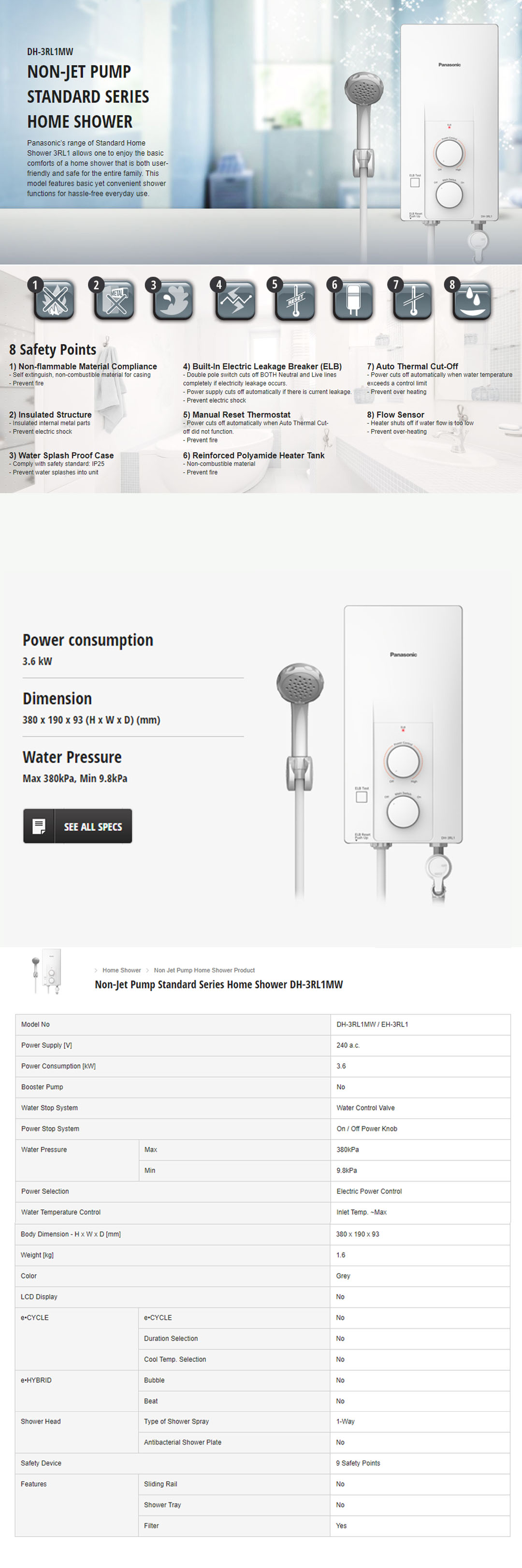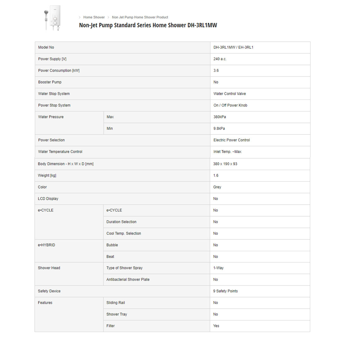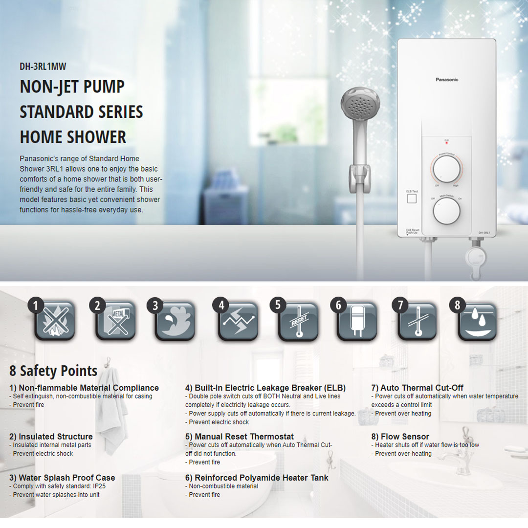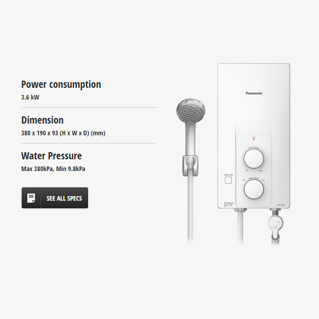 Panasonic 3600W Non Pump Standard Series Home Shower DH-3RL1MW | Safety Points | Water Control Valve | Non Jet Pump | Electric Power Control | Water Heater with 1 Year Warranty