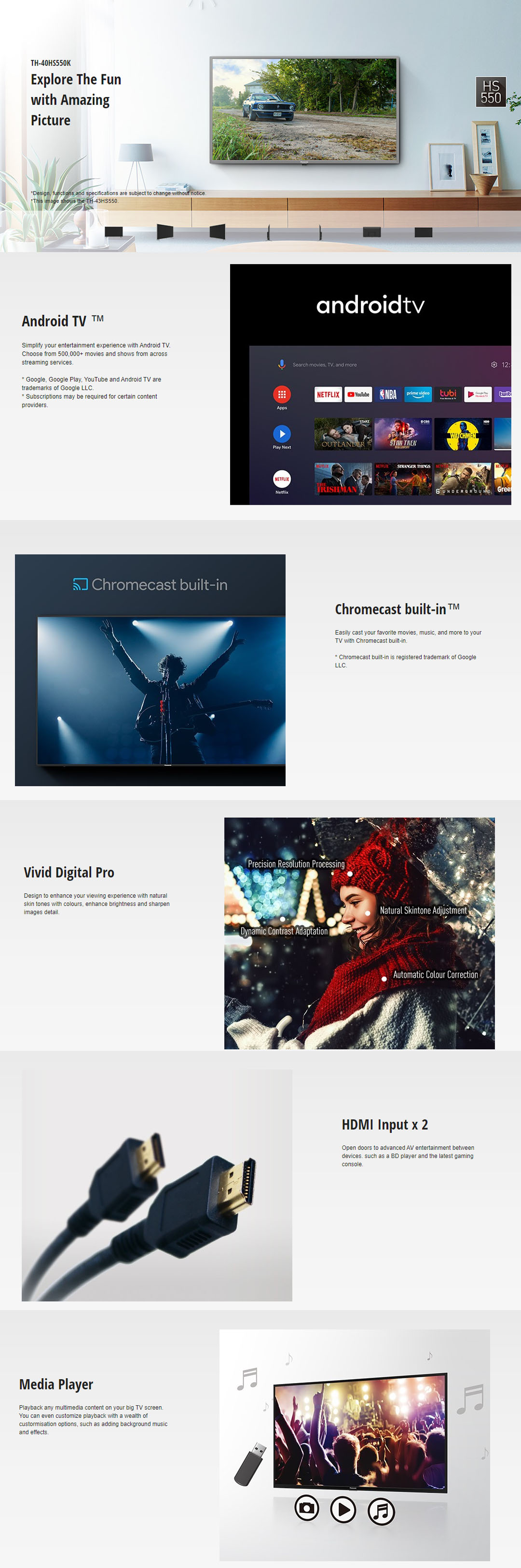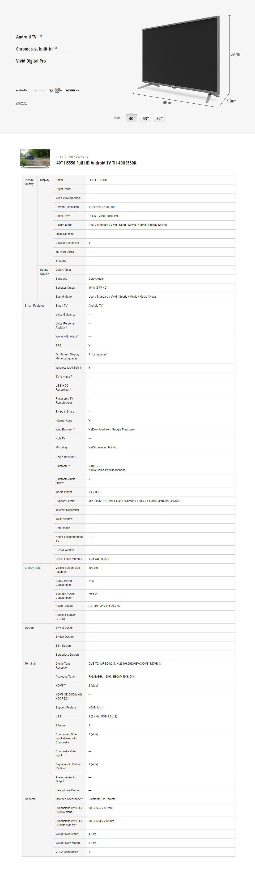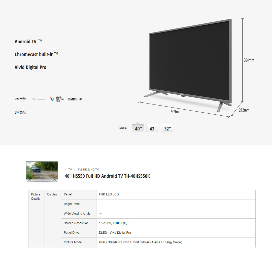 Panasonic 40" FHD Android LED TV TH-40HS550K | Dolby Audio | Bluetooth 5.0 | Chromecast Built-In | HDMI | USB | Ethernet | Web Browser | Android TV with 2 Year Warranty