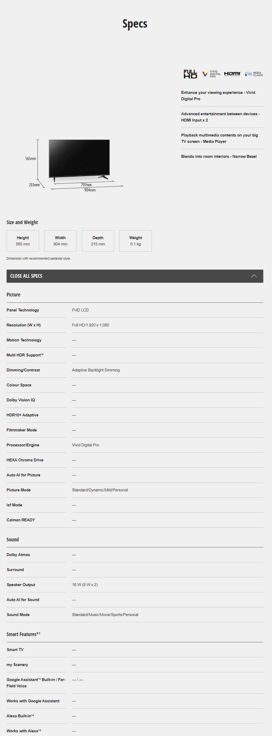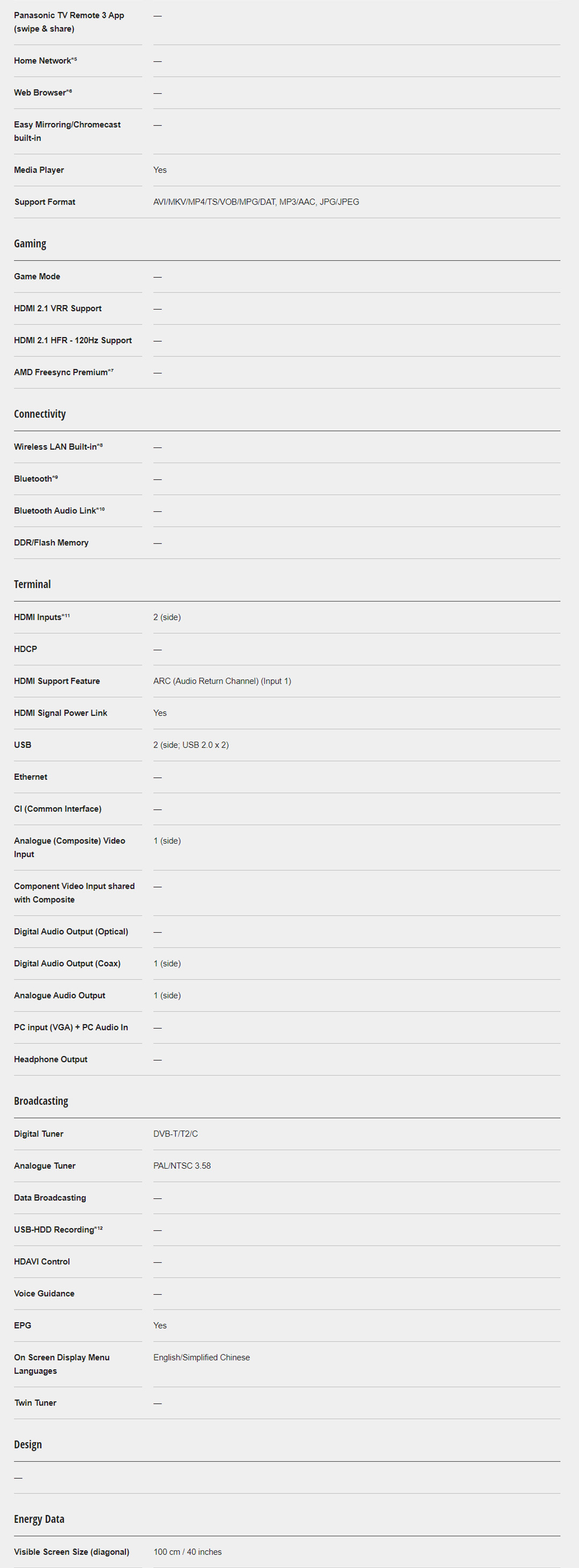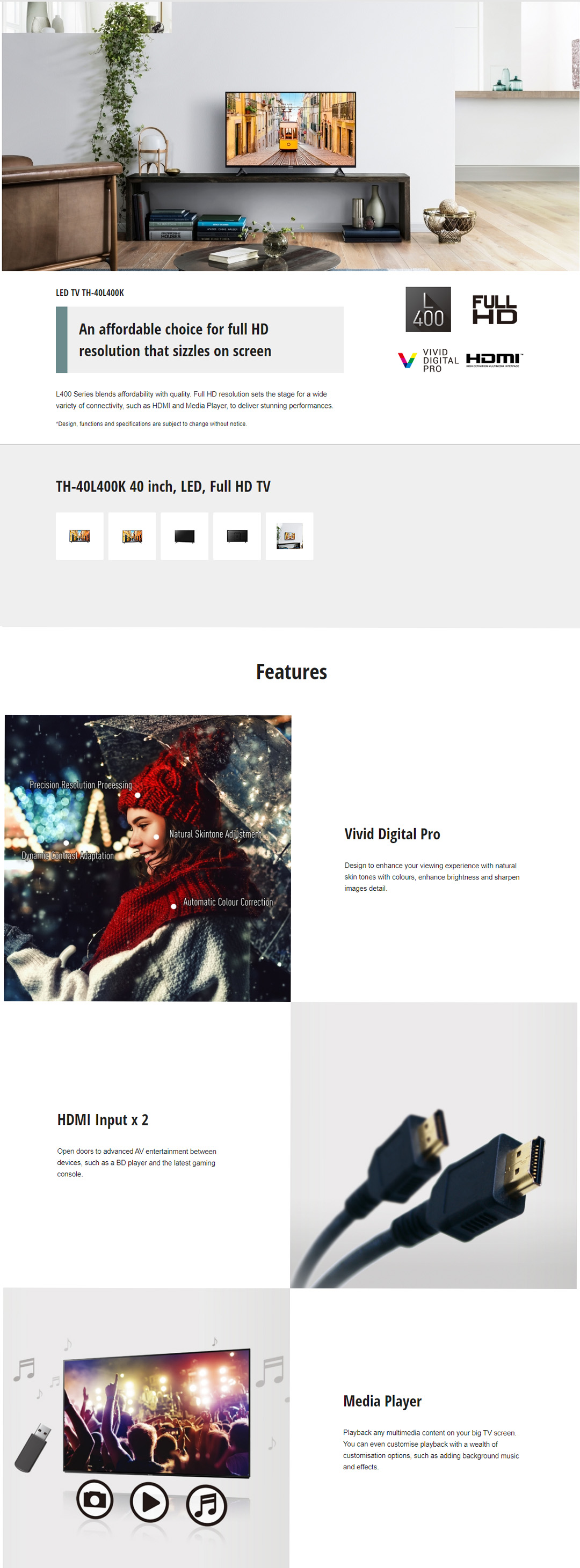 Panasonic 40" FHD LED TV TH-40L400K | Vivid Digital Pro | Media Player | HDMI Input x 2 | Narrow Bezel | Smart TV with 1 Year Warranty