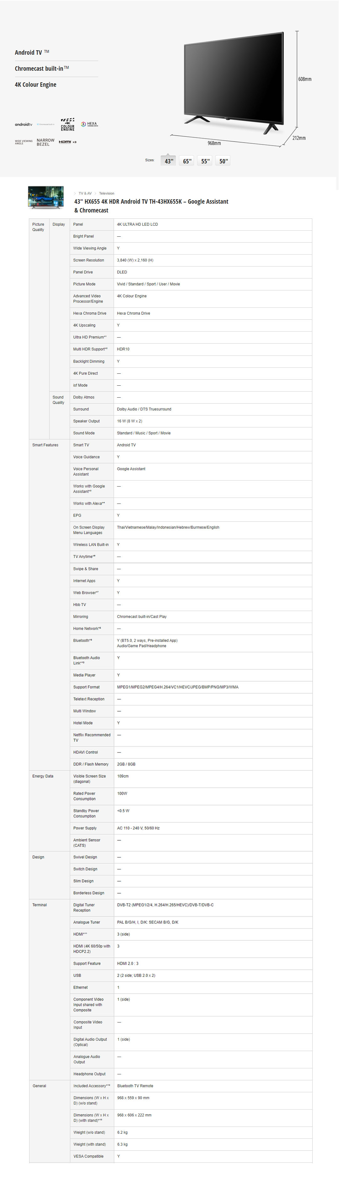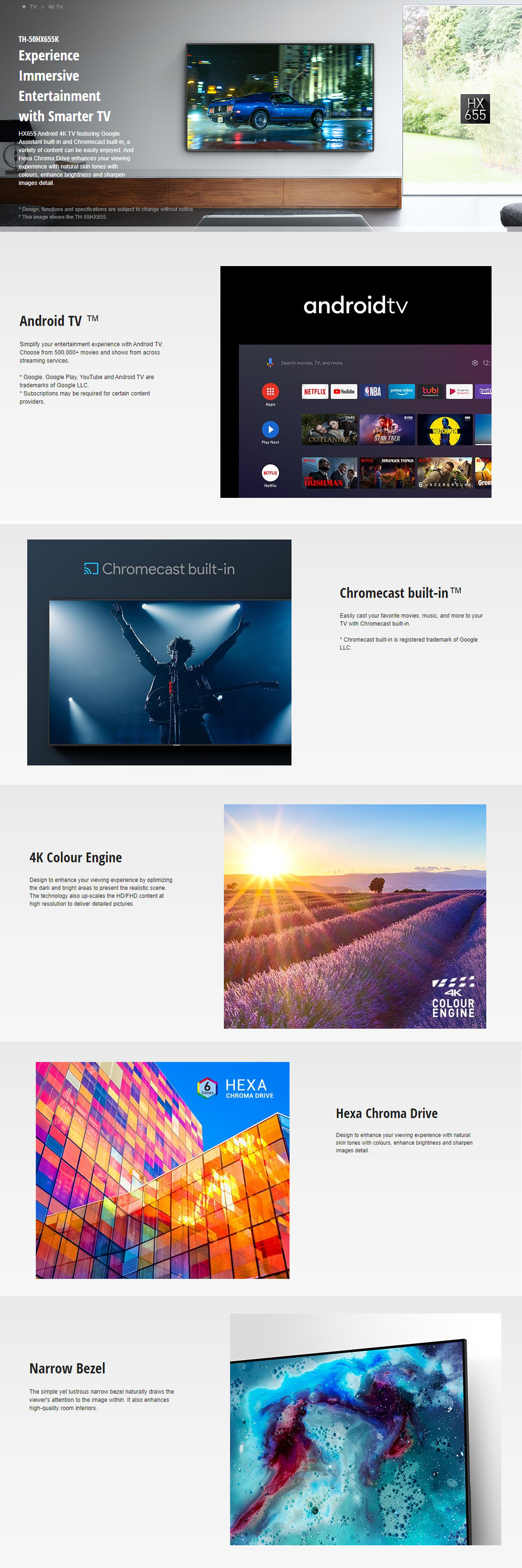 Panasonic 43" 4K HDR Android LED TV TH-43HX655K | Chromecast Built-in | 4K Colour Engine | Hexa Chroma Drive | Wide Viewing Angle | Android TV with 2 Year Warranty