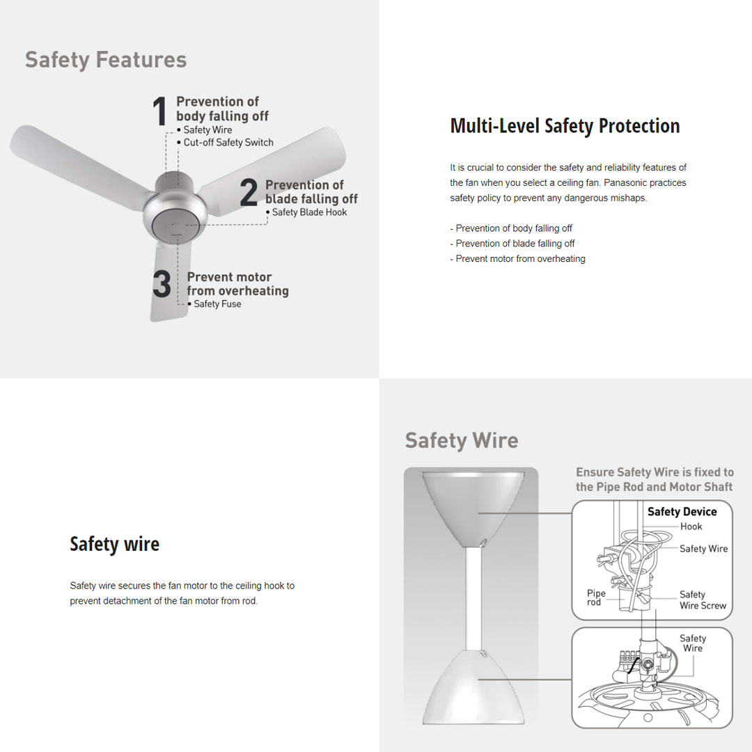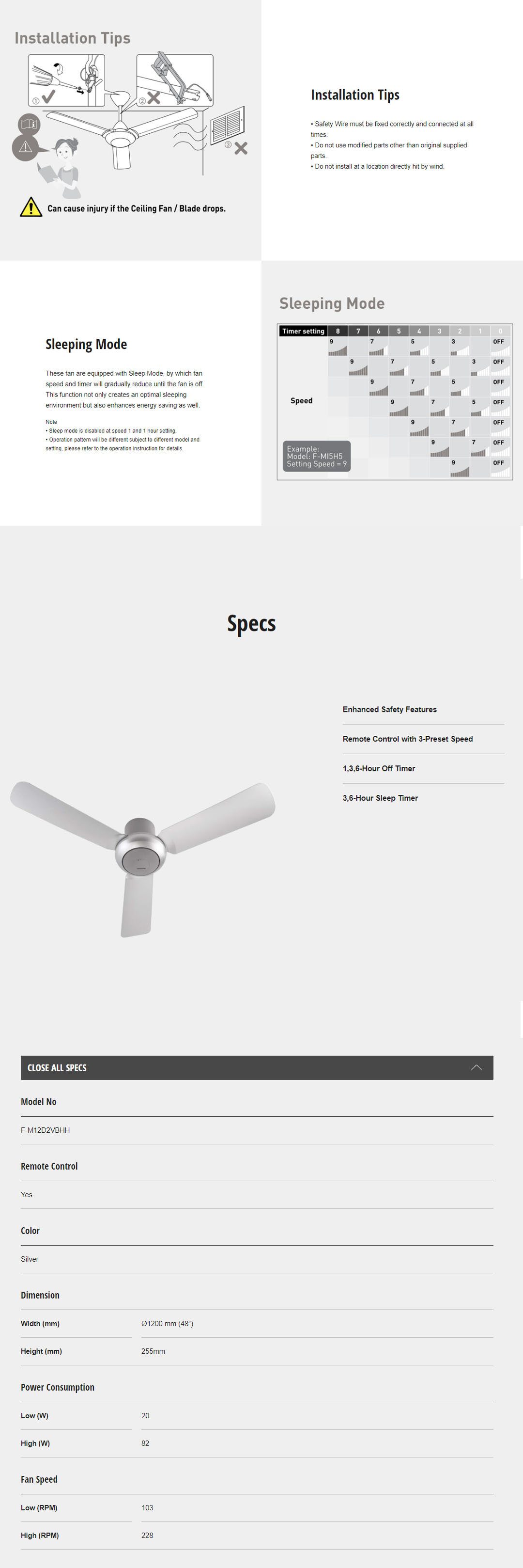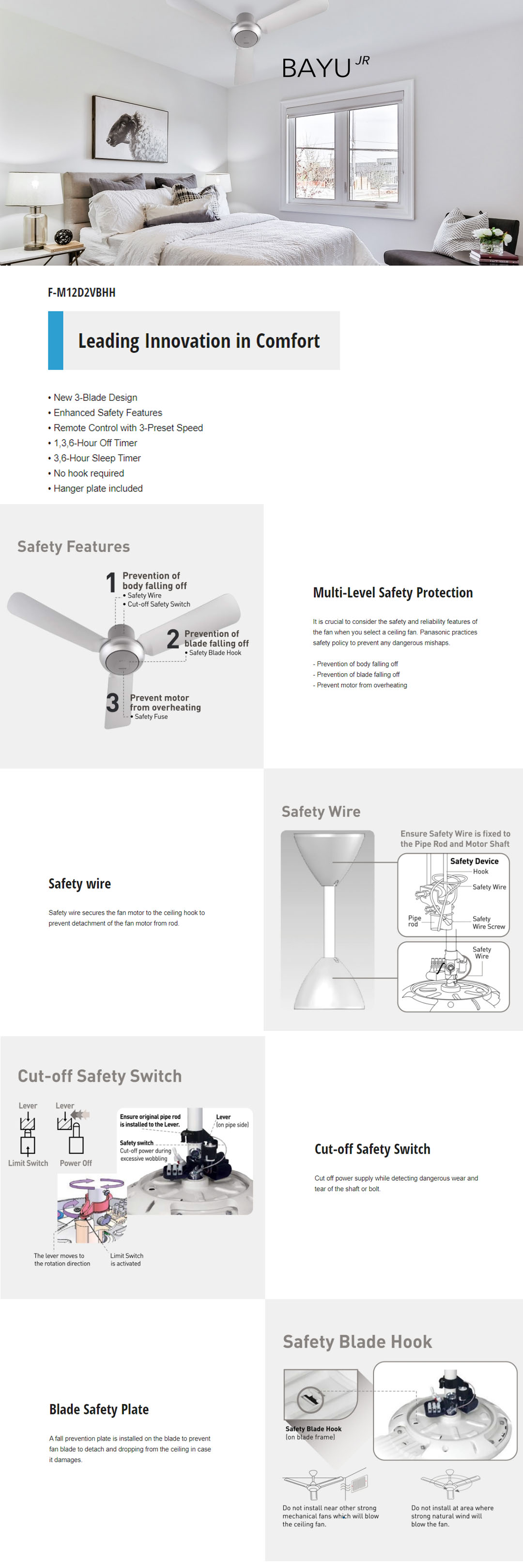 Panasonic 48" Bayu 3 Blade Ceiling Fan F-M12D2VBHH | New 3-Blade Design | Enhanced Safety Features | Remote Control with 3-Preset Speed | 1,3,6-Hour Off Timer | 3,6-Hour Sleep Timer |