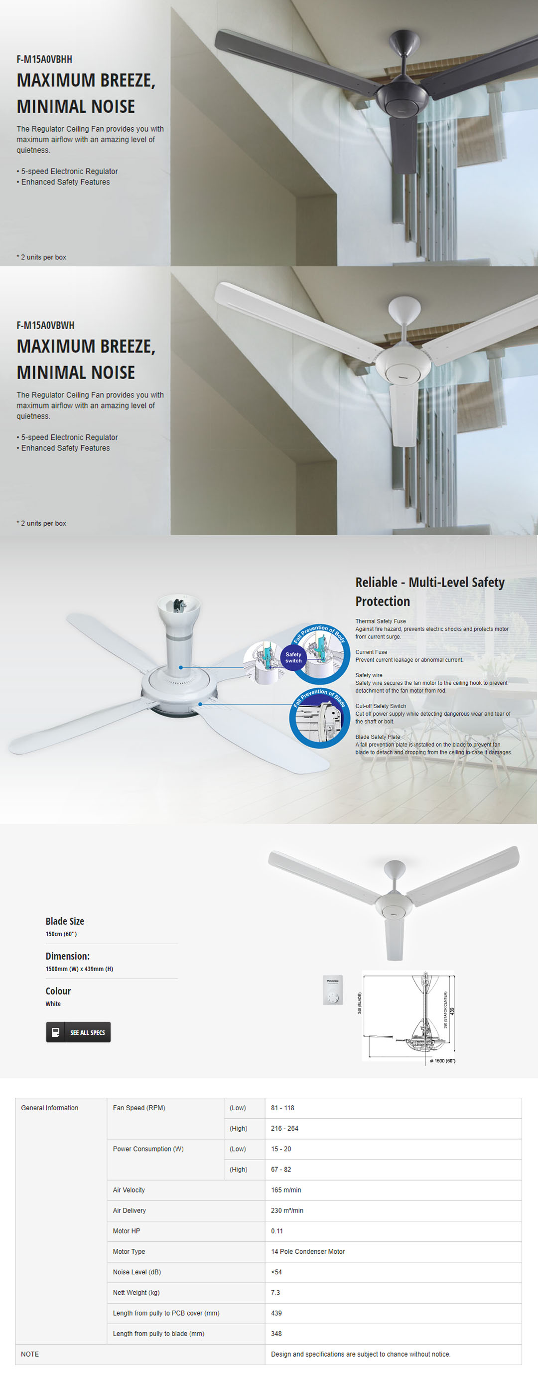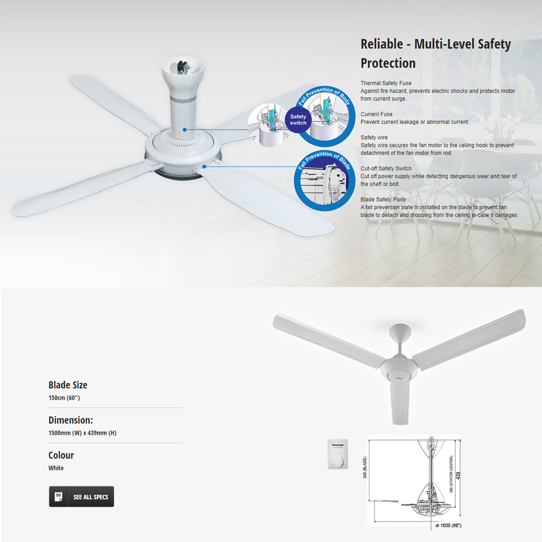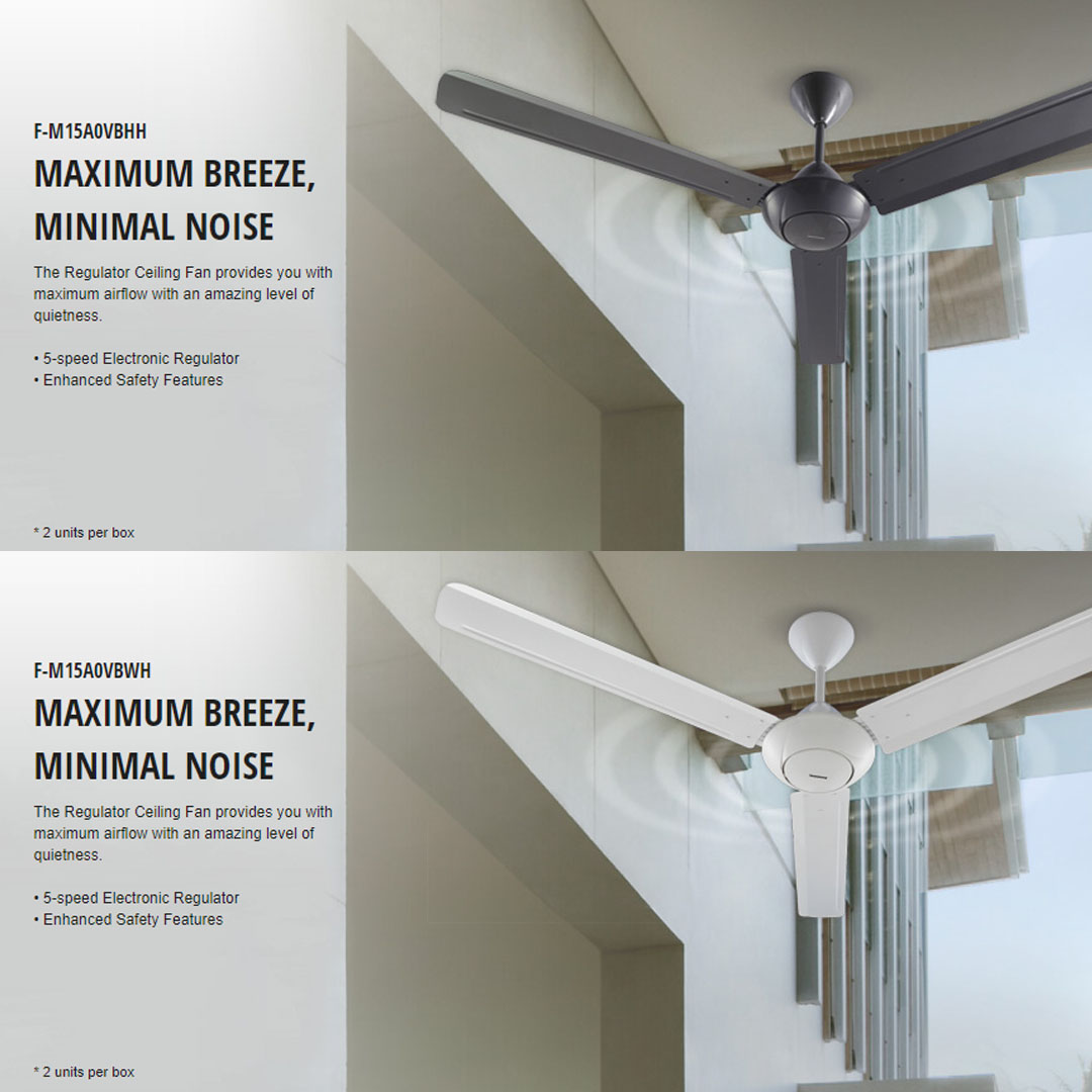 Panasonic 60" Regulator 3 Blade Ceiling Fan F-M15A0VBHH / F-M15A0VBWH | 5-speed Electronic Regulator | Low Noise | Enhanced Safety Features | Ceiling Fan with 1 Year Warranty