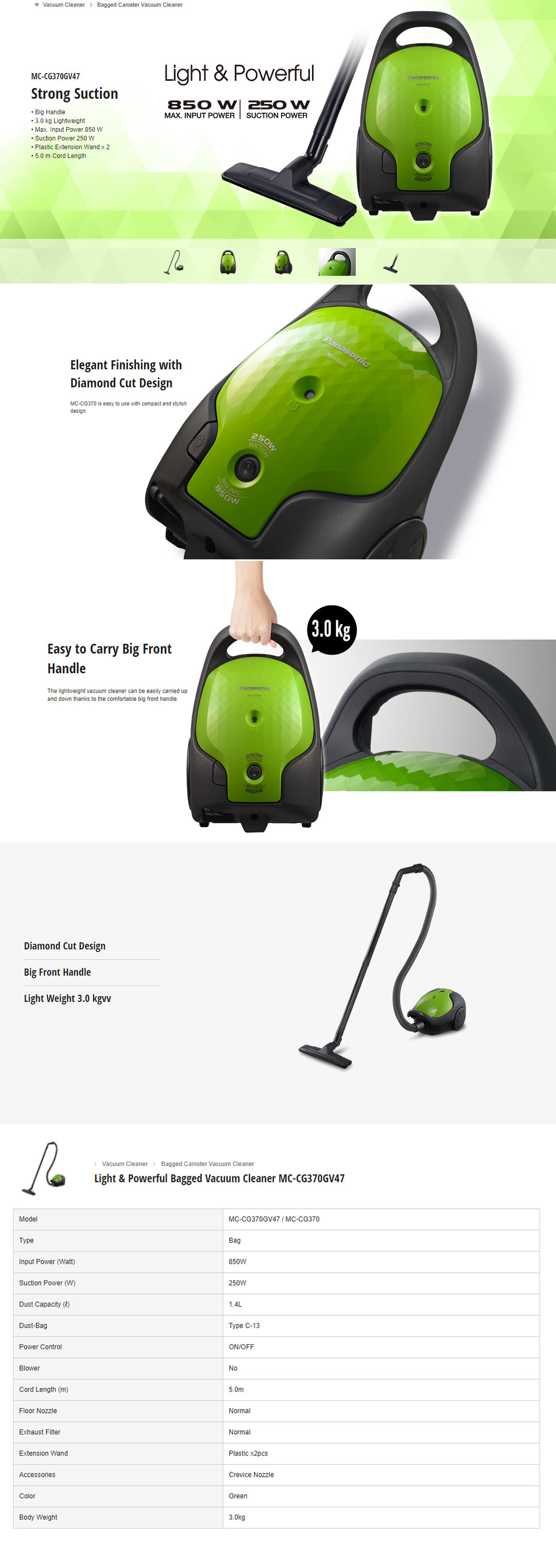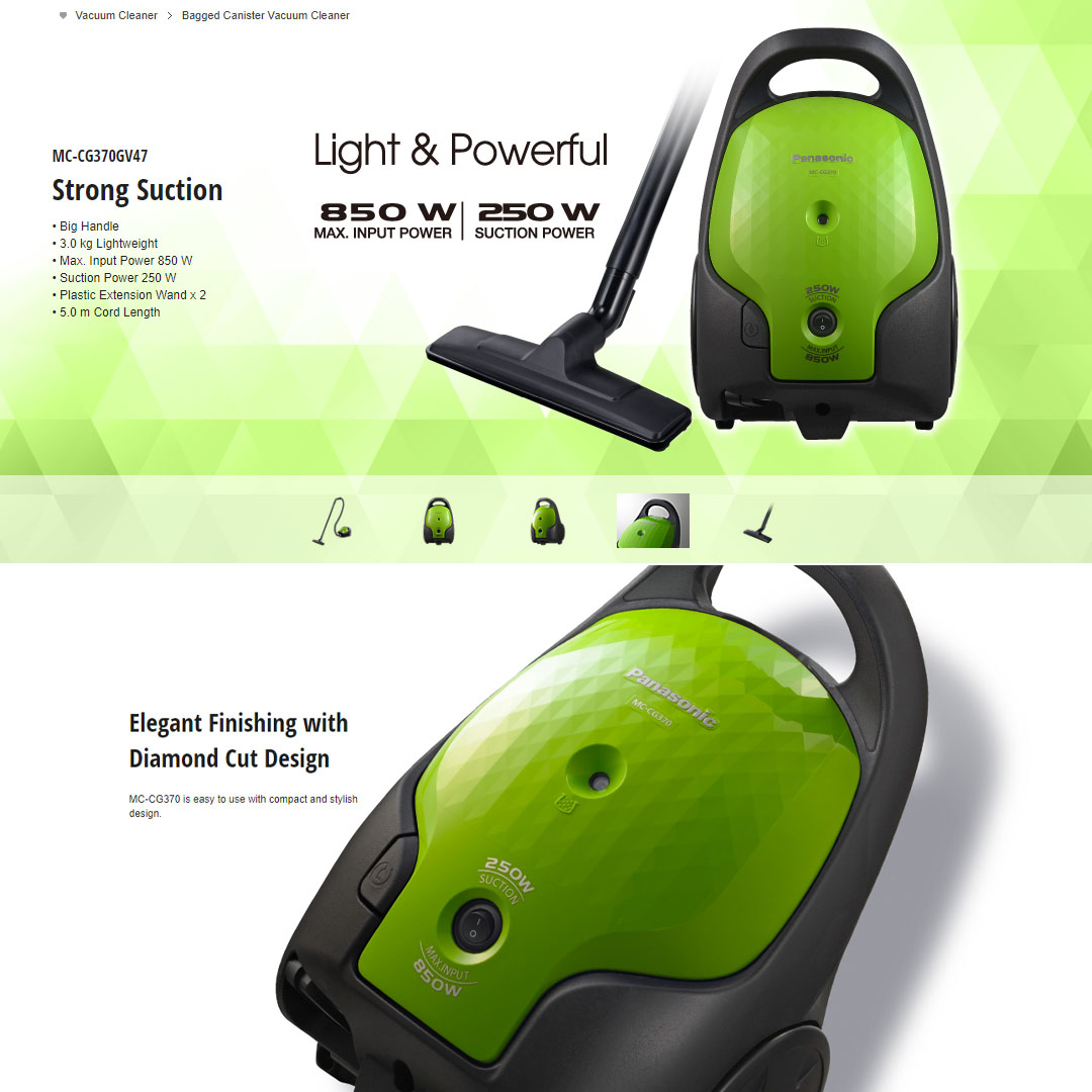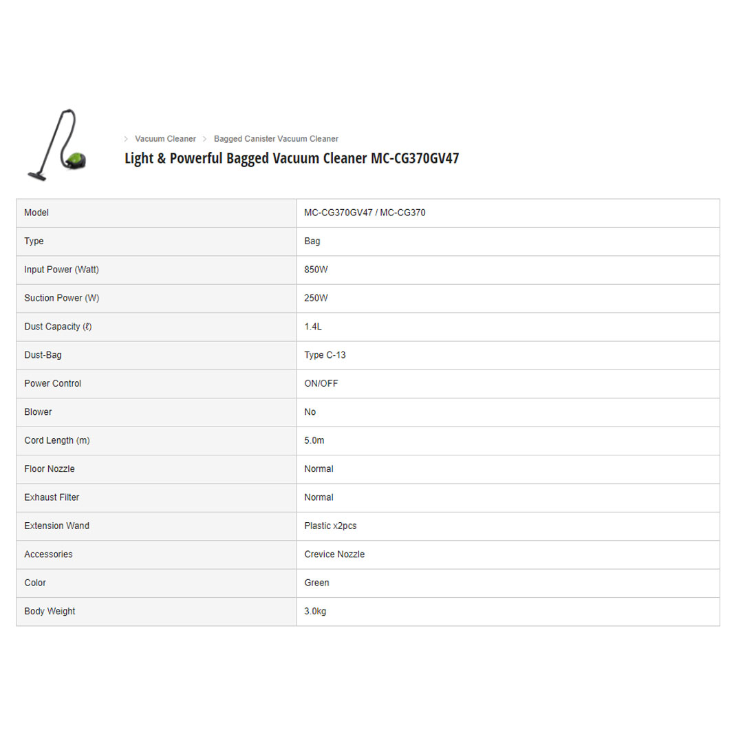 Panasonic 850W Bagged Vacuum Cleaner MC-CG370GV47 | Strong Suction | 5.0m Cord Length | 1.4L Dust Capacity | Bagged Vacuums with 1 Year Warranty