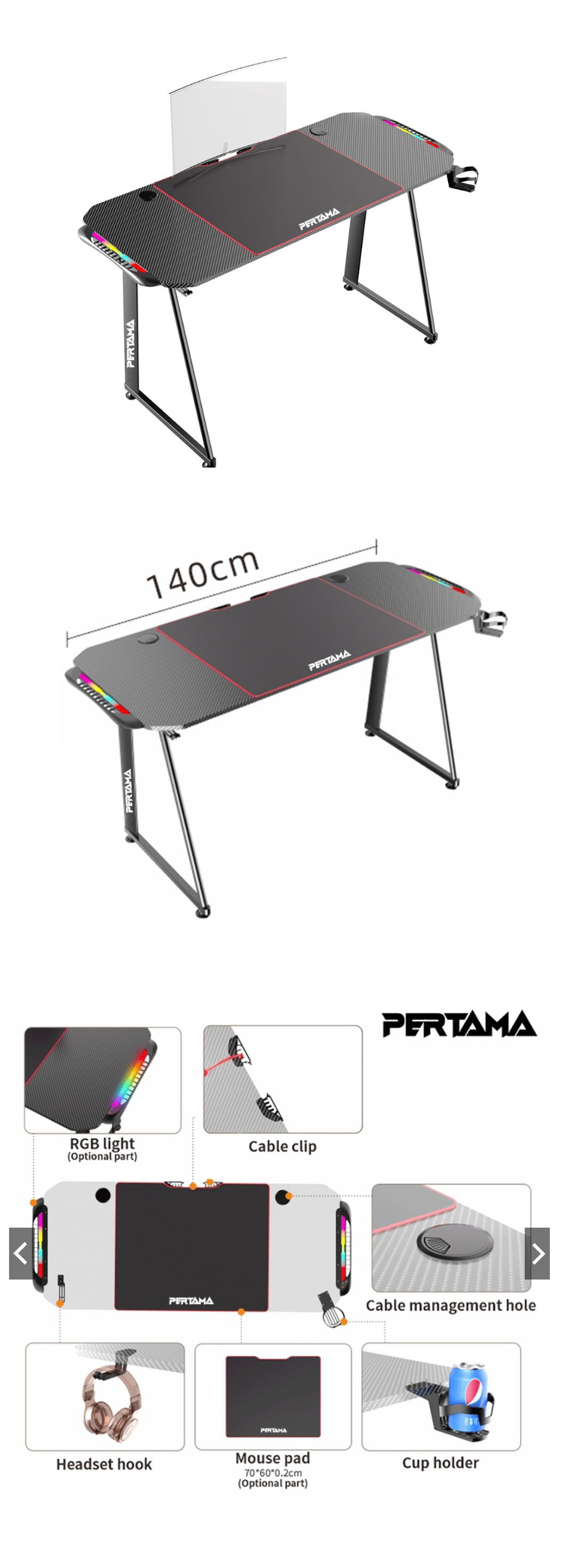 Pertama A1 Gaming Desk Gaming Table | Non-slip Carbon Fiber Tabletop | Dimension: 140 X 60 X 75 CM | With Headset Hook & Cup Holder | Gaming Table with 2 Years Warranty