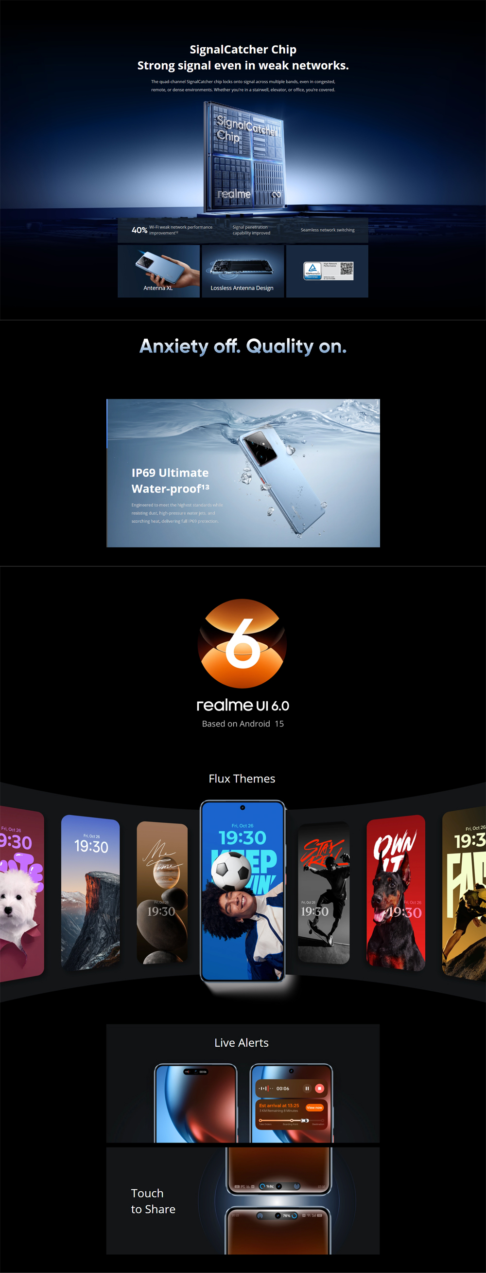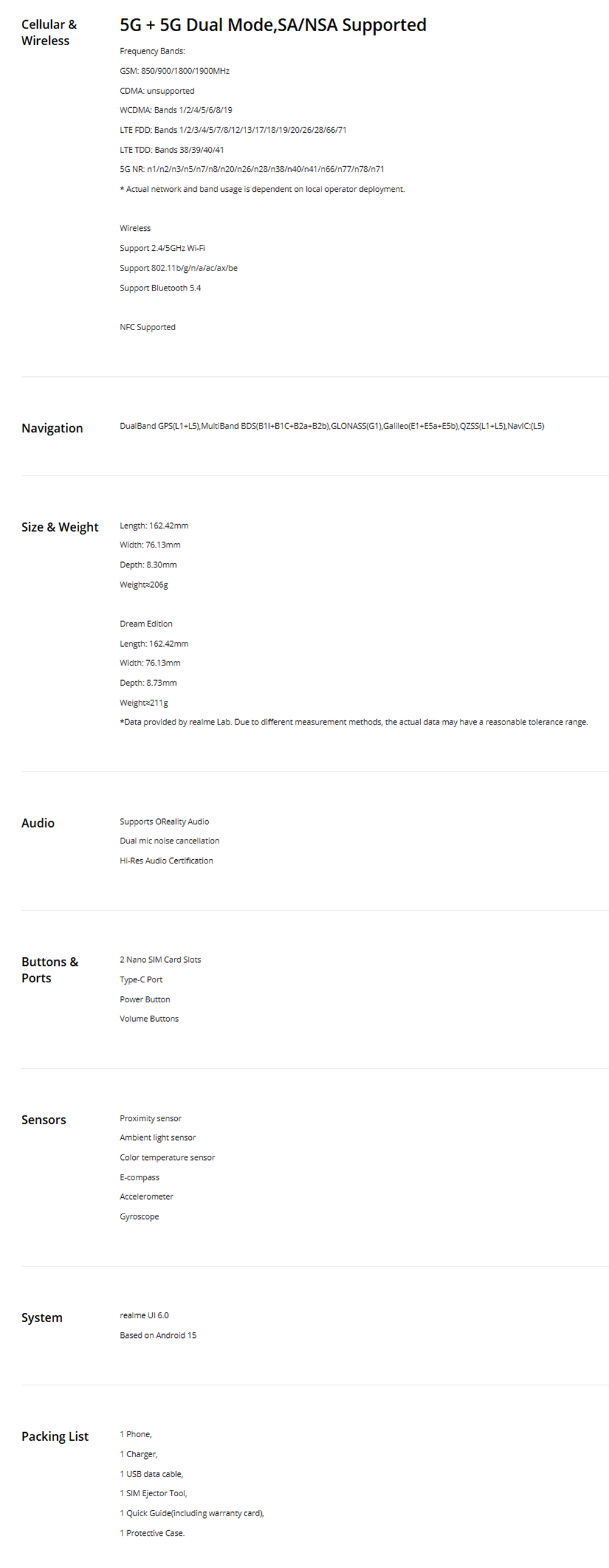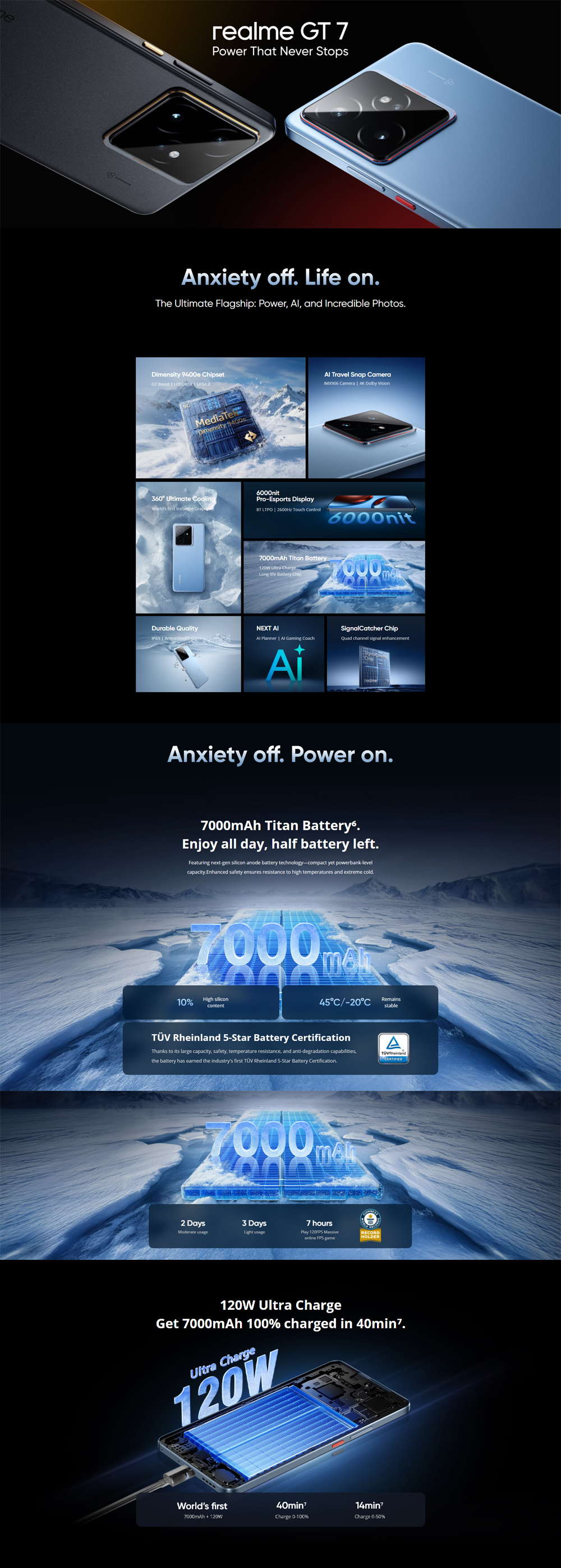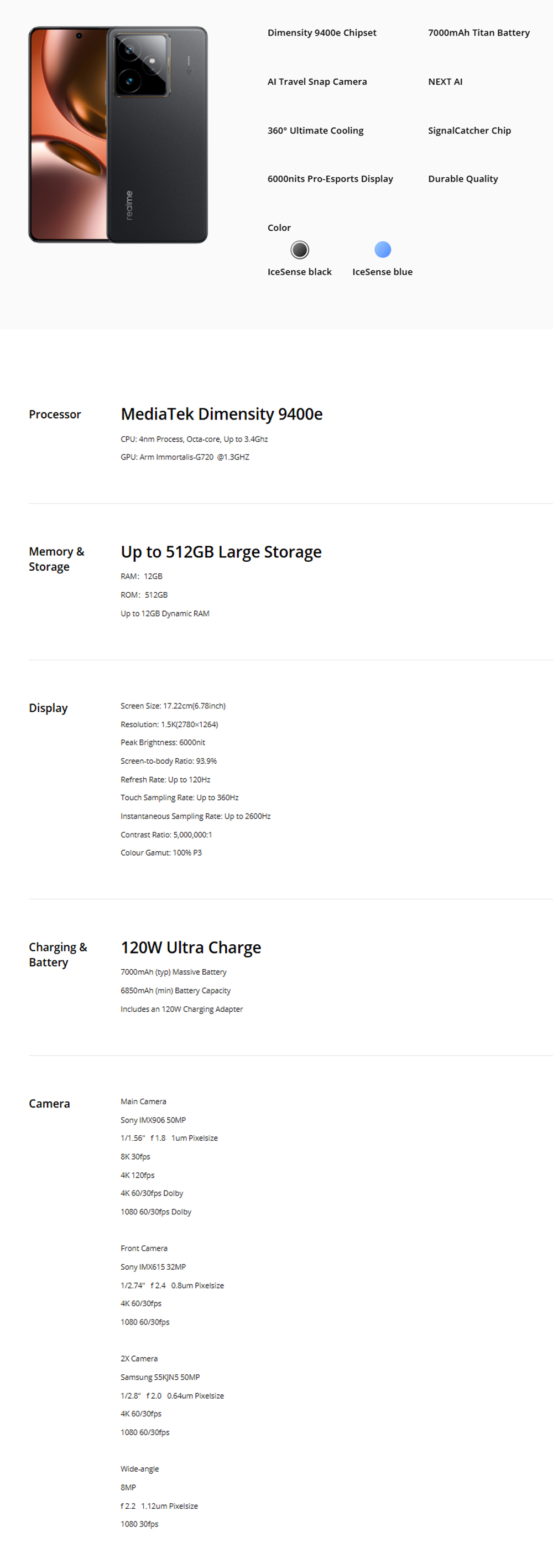 realme GT 7 12GB+512GB | 6.78 inches, LTPO AMOLED | 50MP Rear Camera | Mediatek Dimensity 9400e (4 nm) | 1264 x 2780 pixels | Li-Po 7000mAh, 120W wired