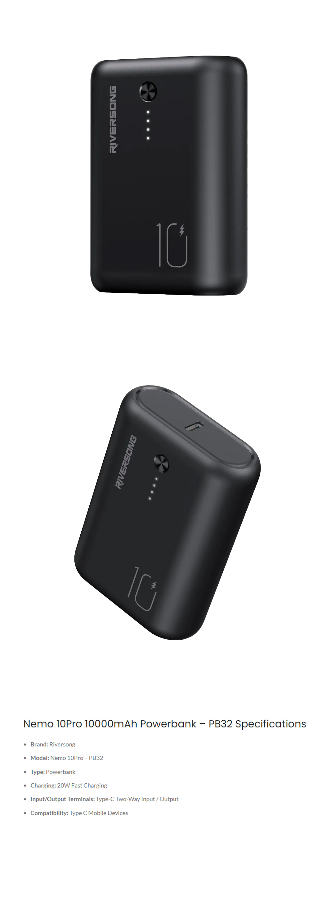 RIVERSONG 10000mAh Nemo 10 Pro Mini Power Bank PB32 Pro | 20W Fast Charging | Type-C Two-Way Input & Output | Power Bank with 1 Year Warranty