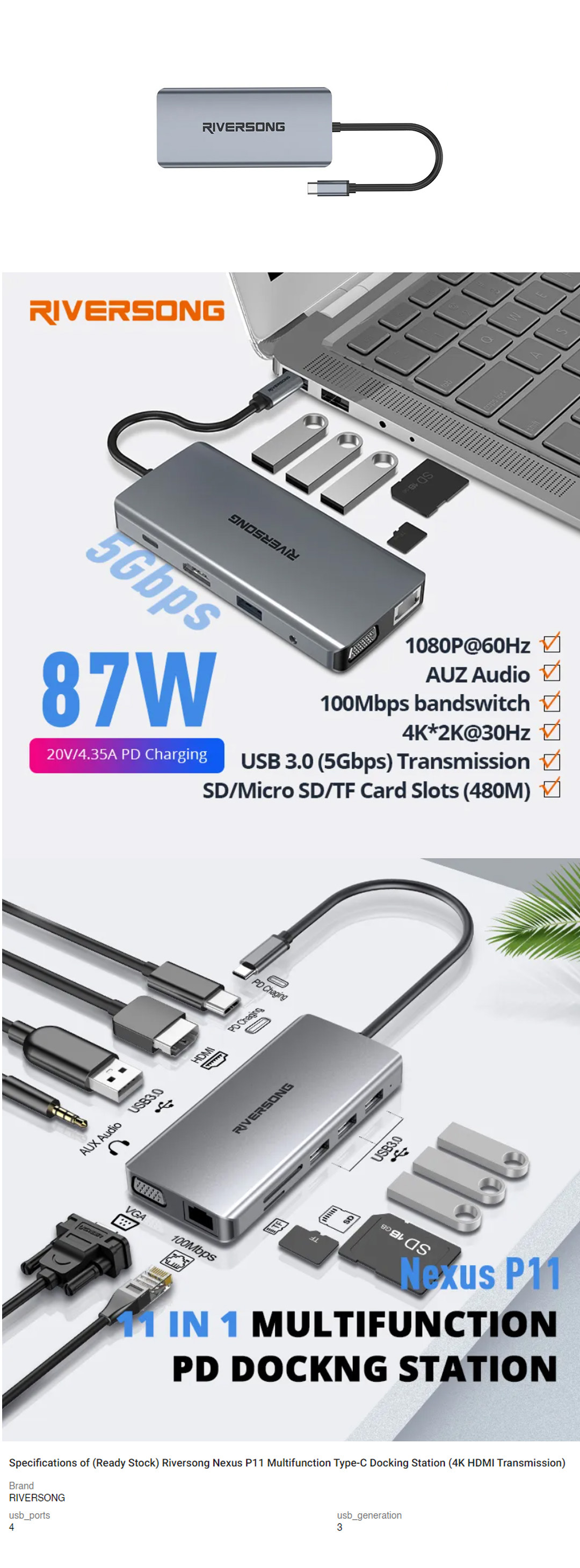 RIVERSONG Nexus P11 Multifunction Type-C Docking Station HB11 | AUZ Audio | 100Mbps Bandswitch | USB 3.0 (5Gbps) Transmission | Accessories with 1 Year Warranty