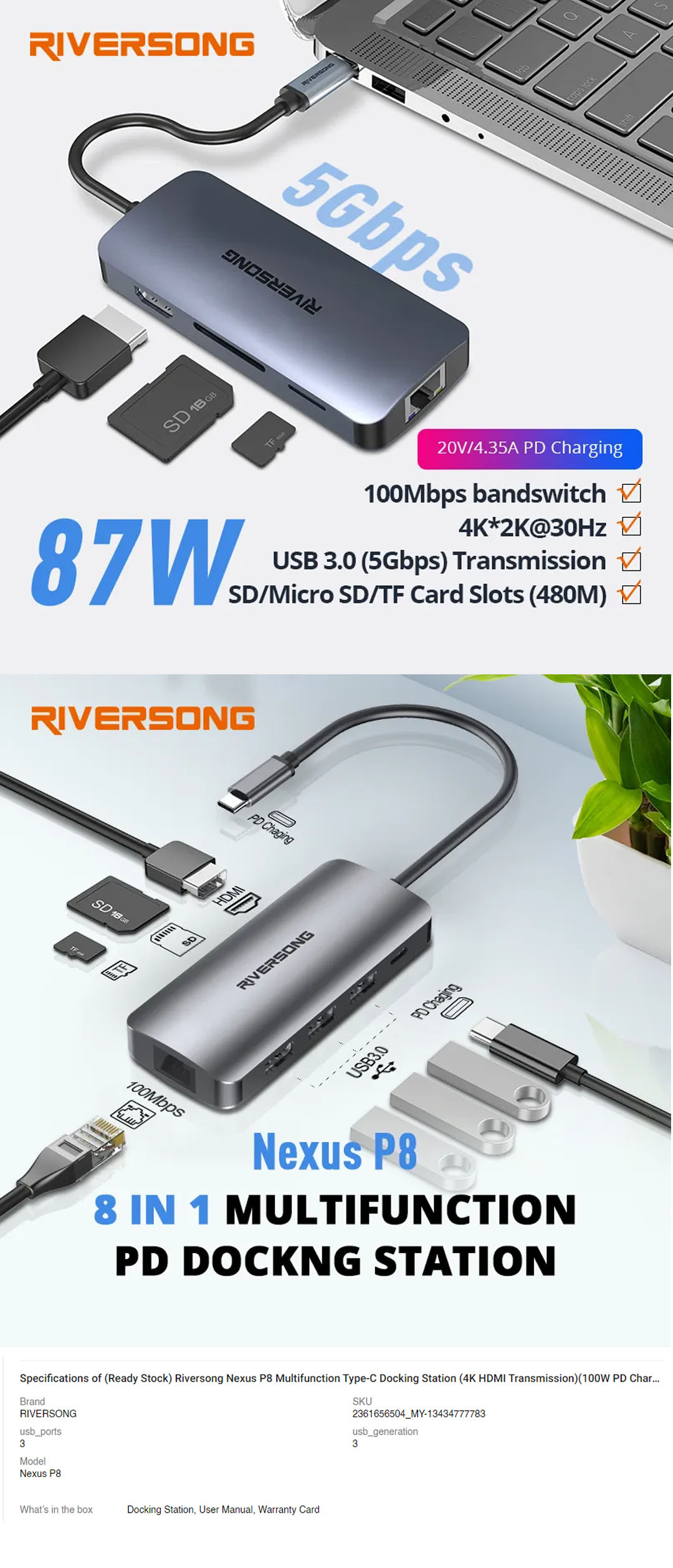 RIVERSONG Nexus P8 Multifunction Type-C Docking Station HB08 | 4K*2K @30Hz | 8 in 1 Multifunction | (5Gbps) Transmission | Docking Station with 1 Year Warranty