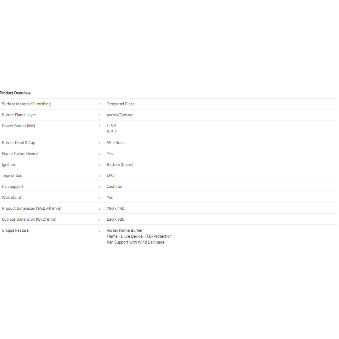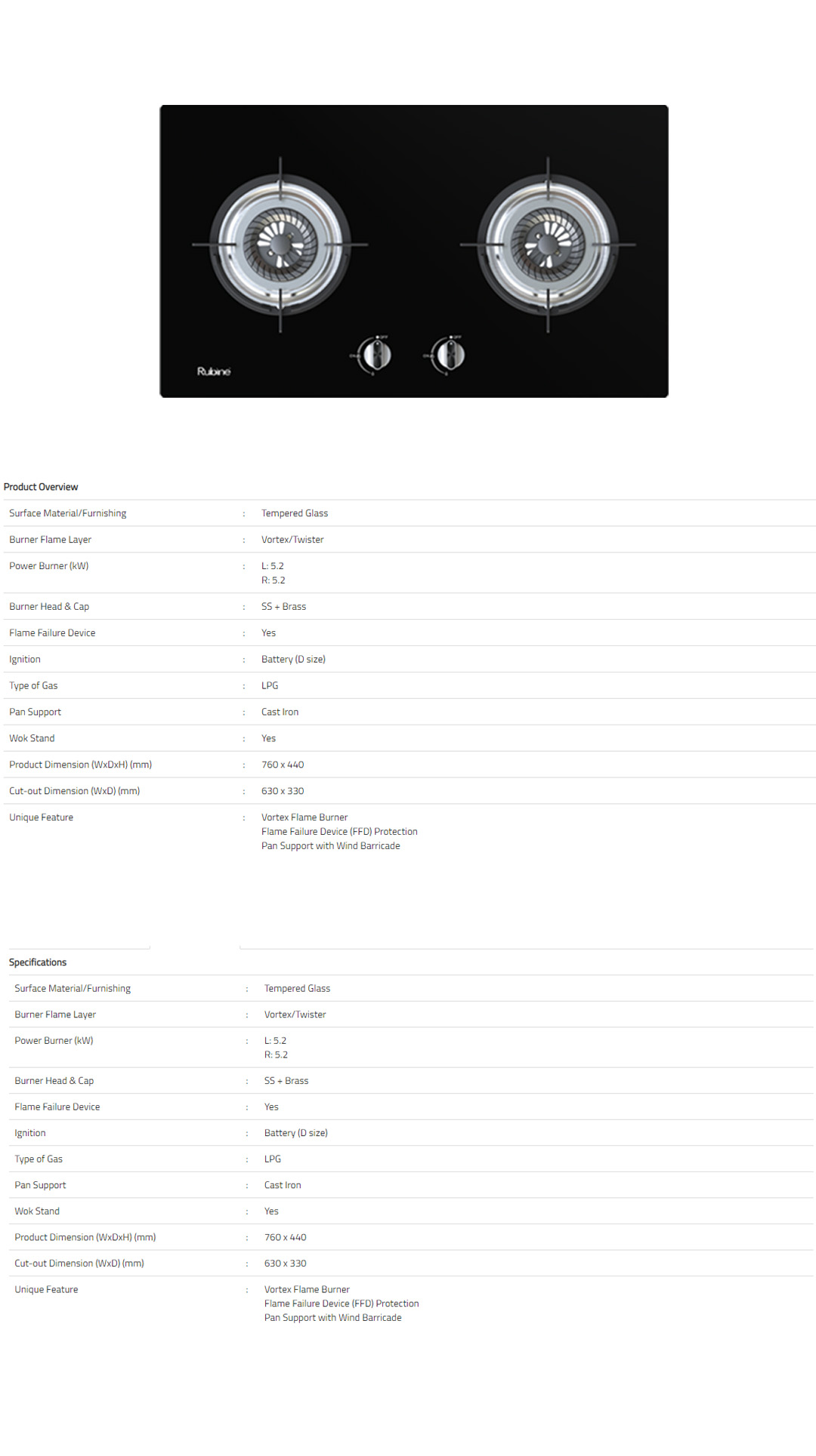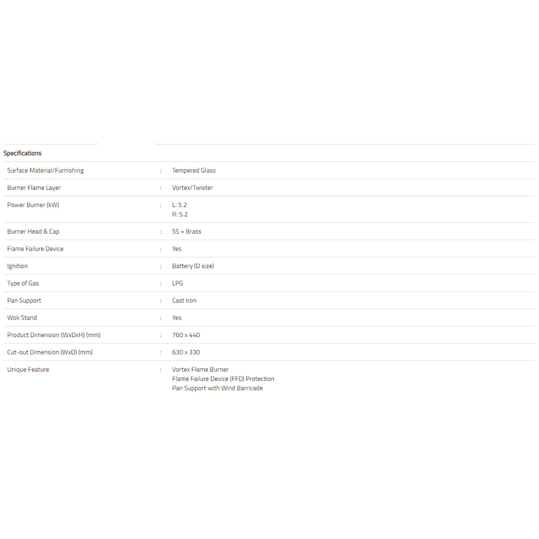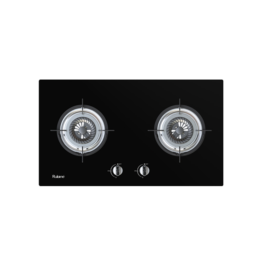 Rubine 2 Burners Built-In Gas Hob RGH-CALDO2B-BL | Tempered Glass Furnishing | Flame Failure Device (FFD) Protection | LPG Gas | Cast Iron Pan | 2 Burners with 1 Year Warranty