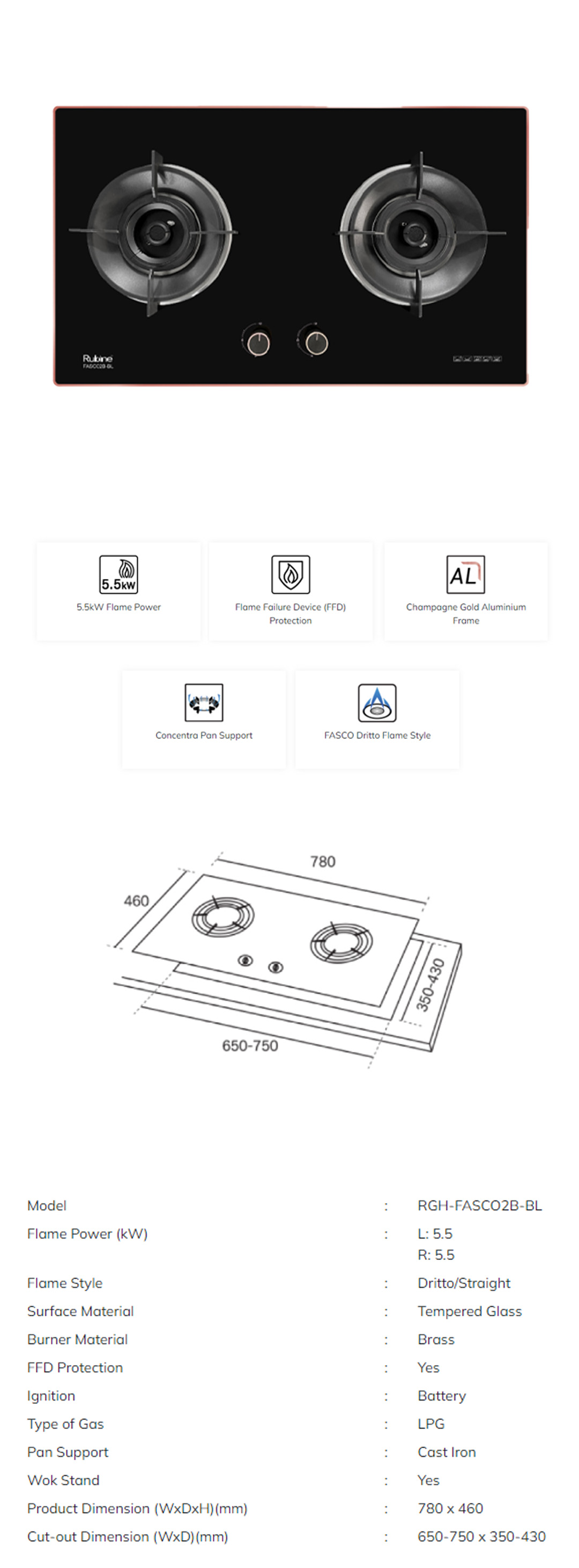 Rubine 2 Burners Built-in Glass Gas Hob RGH-FASCO2B | 5.5kW Flame Power | FASCO Dritto Flame Style | Concentra Pan Support | Hob with 1.5 Year Warranty