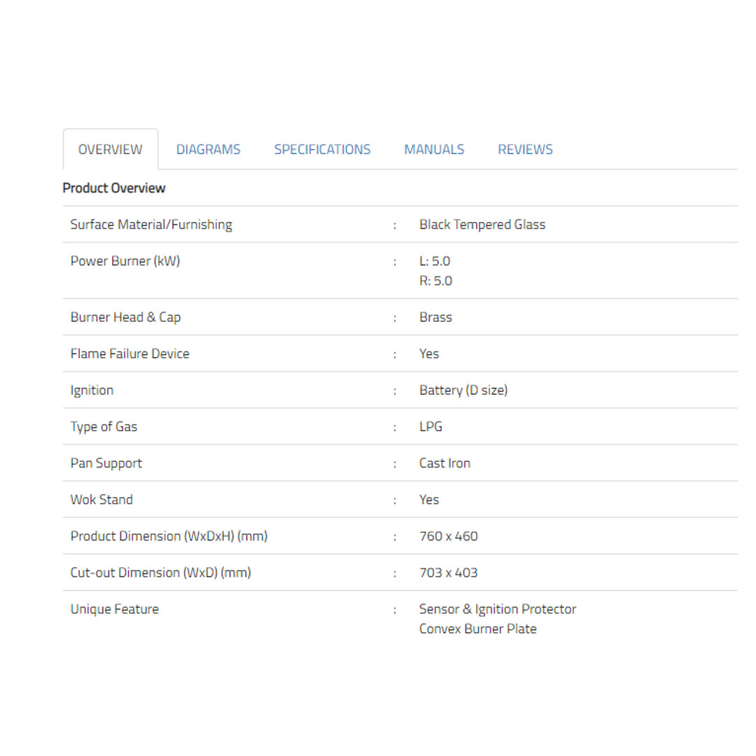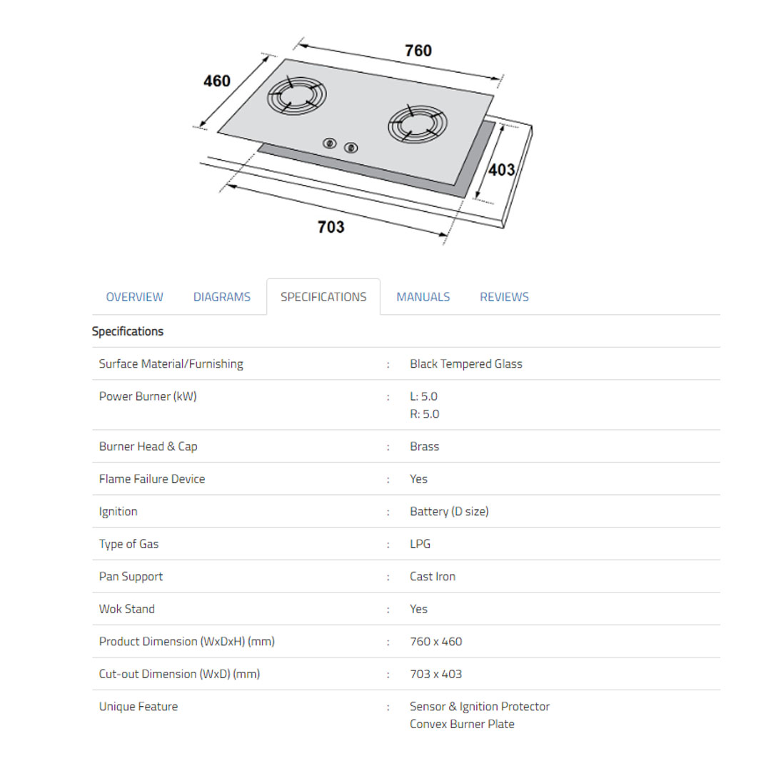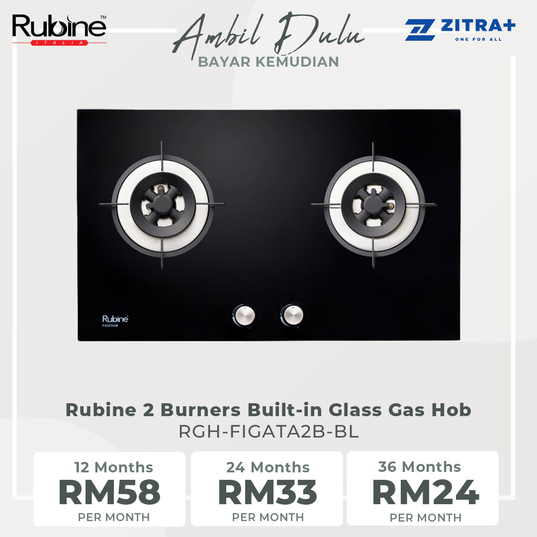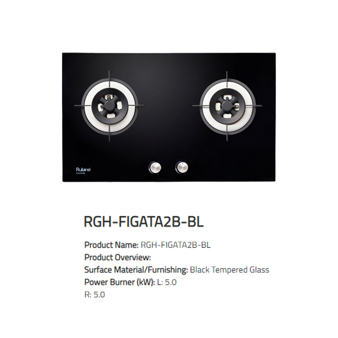 Rubine 2 Burners Built-in Glass Gas Hob RGH-FIGATA2B-BL | Power Burner (kW) : L: 5.0 R: 5.0 | Brass Burner Head & Cap | Sensor & Ignition Protector Convex Burner Plate | Hob with 1 Year Warranty