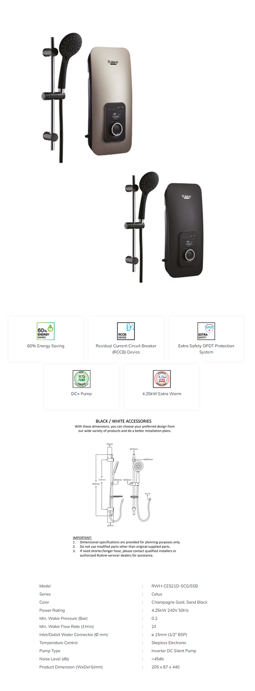 Rubine 3600W Cetus Series DC Pump Instant Water Heater | RWH-CE521D-SCG / CE521D-SSB | 60% Energy Saving | DC+ Pump | Extra Safety DPDT Protection System | Water Heater with 1 Year Warranty