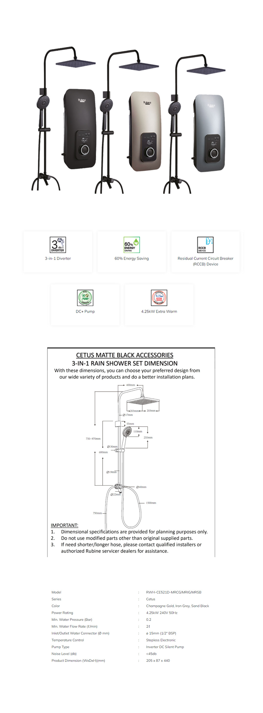Rubine 3600W Cetus Series DC Pump Instant Water Heater with Rain Shower | RWH-CE521D-MRCG / RWH-CE521D-MRIG / RWH-CE521D-MRSB | 4.25kW (Extra Warm) | 3-in-1 Diverter | 60% Energy Saving | Water Heater with 1 Year Warranty