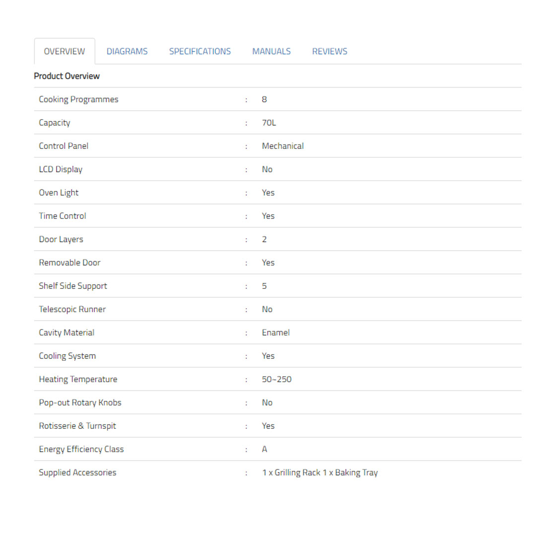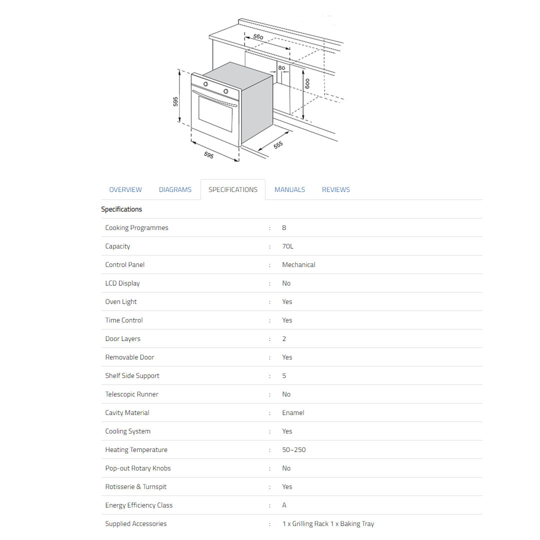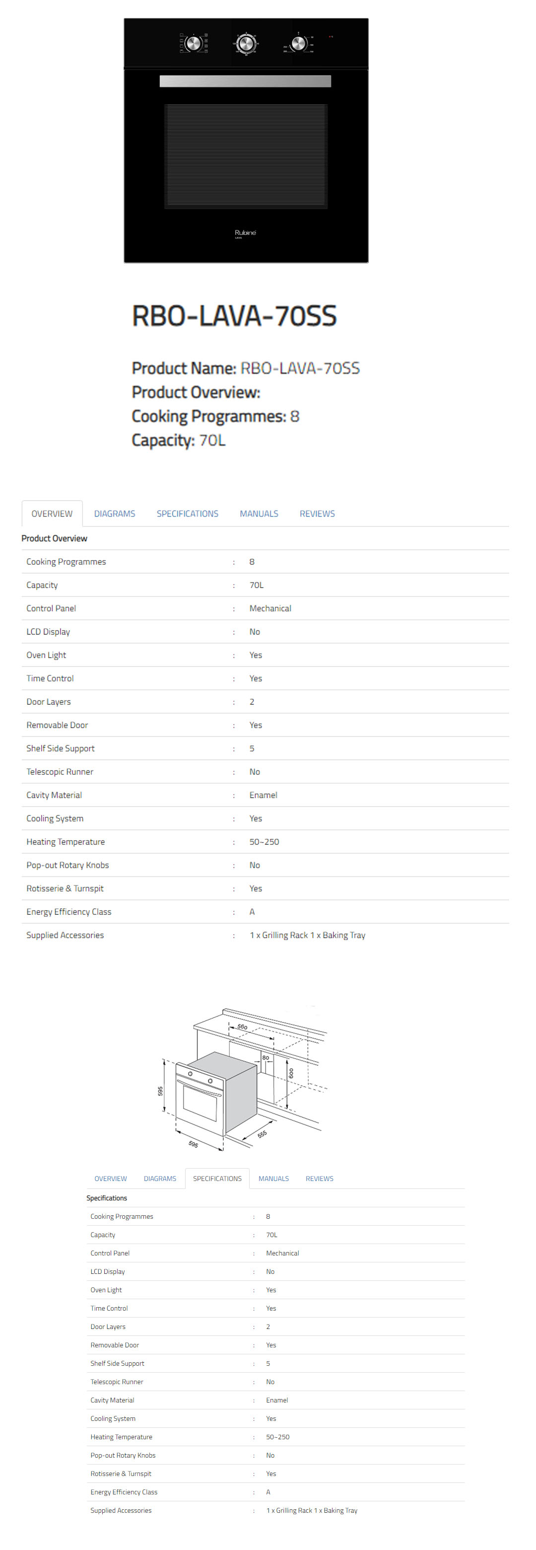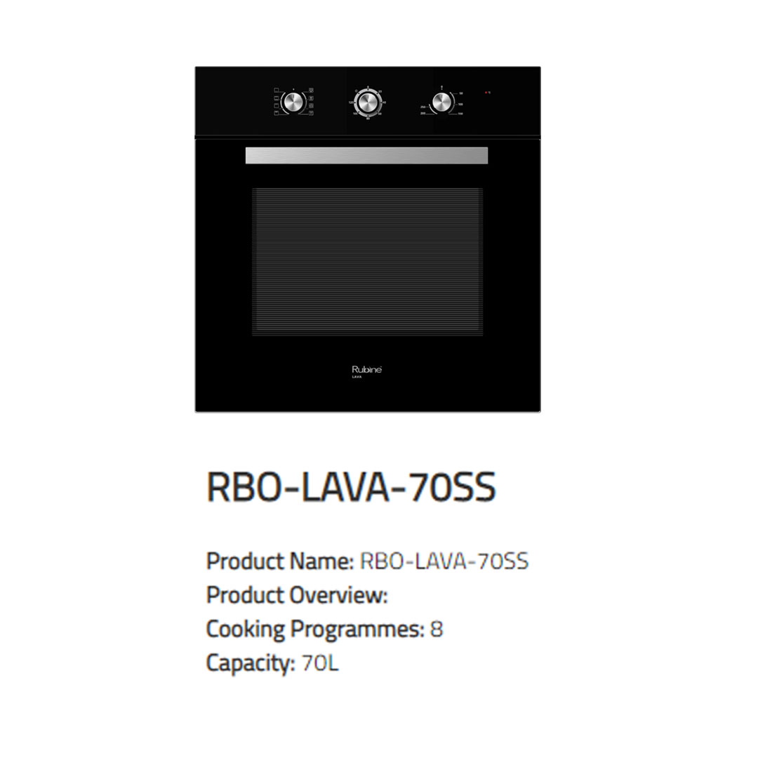 Rubine 70L Build-in Oven RBO-LAVA-70SS | A-Class Energy Efficiency | 8 Cooking Programmes | Mechanical Control Panel | Double Glazed Door | Built-In Oven with 1 Year Warranty