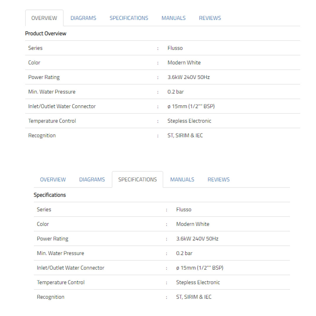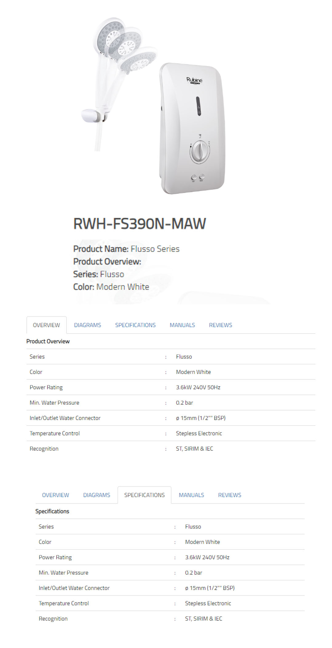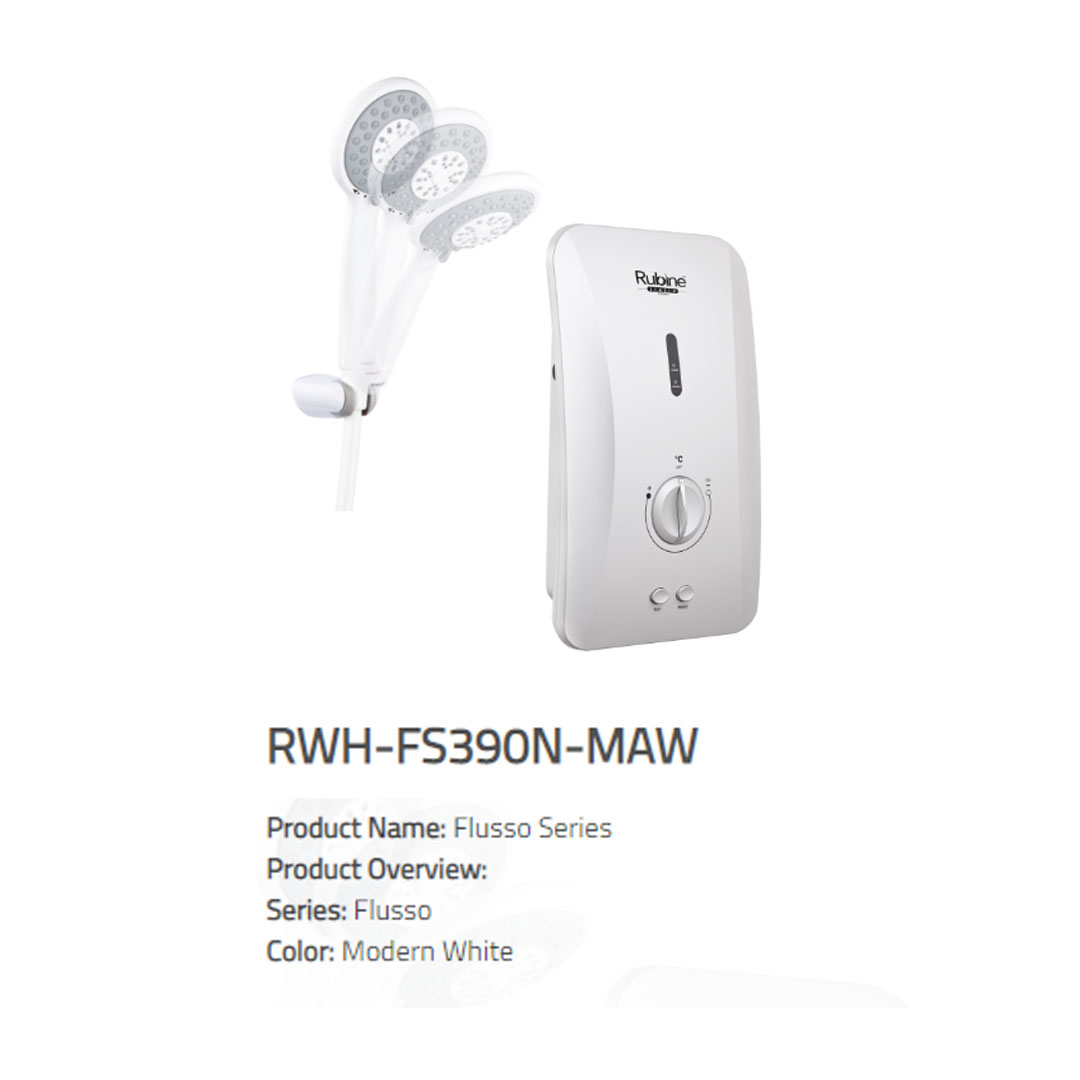 Rubine Flusso Series Non Pump Instant Water Heater RWH-FS390N-MAW | Double Pole ELCB | Double Thermal Cut Off | 5 Spray Pattern Hand Shower | IP25 Splash Proof Protection | Water Heater with 1 Year General Warranty & 10 Years Anti-Tank Leakage Warranty