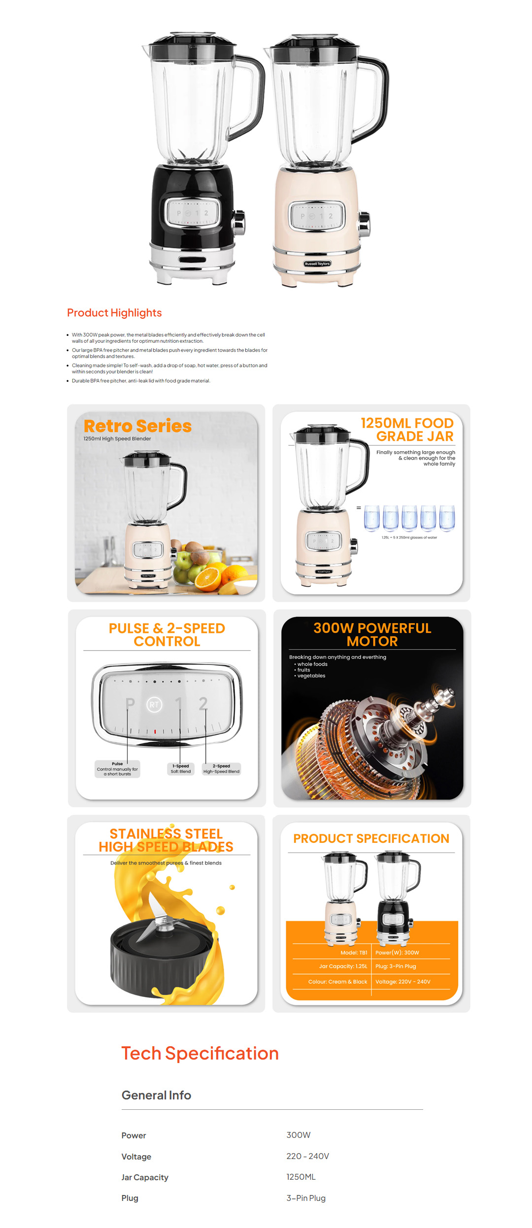 Russell Taylors 1.25L High-Speed Retro Blender TB1 | 300W Power | 2 Speeds + Pulse Function | Safety Locking | Blender with 2 Year Warranty
