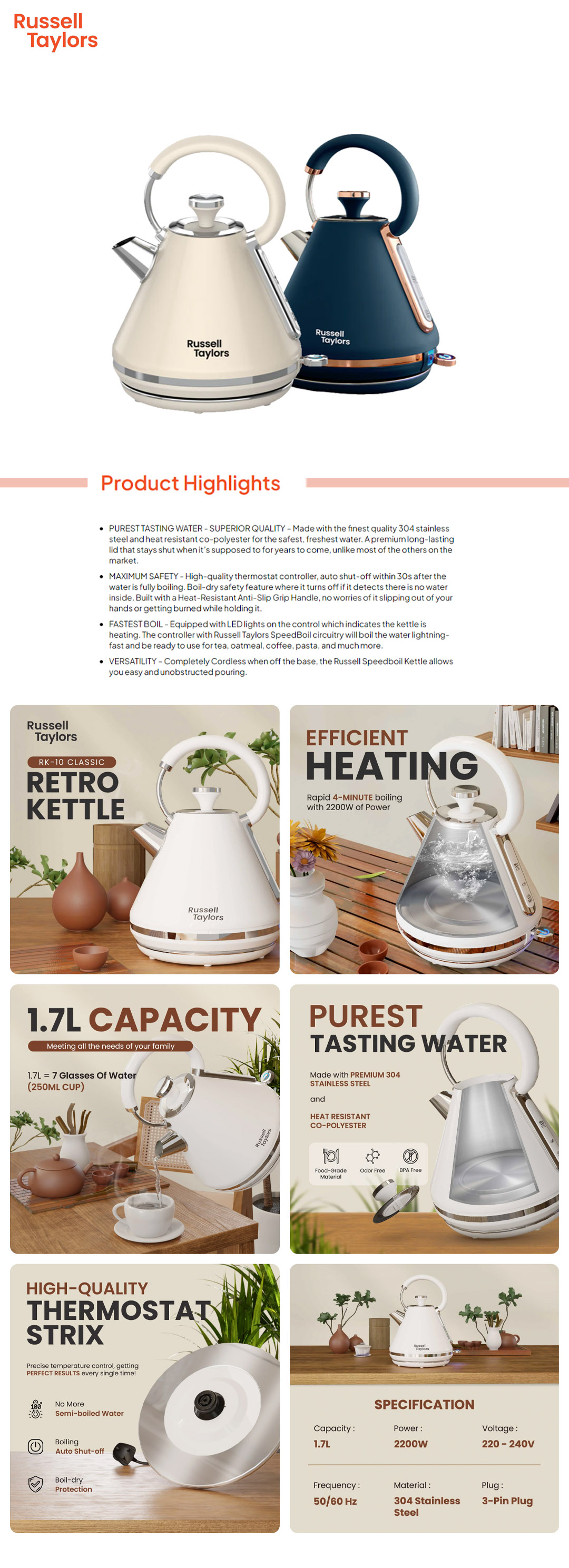 Russell Taylors 1.7L SpeedBoil Retro Kettle RK-10 | Concealed Stainless Steel Heating Element | Boil Dry | Overheat Protection | Kettle with 2 Year Warranty