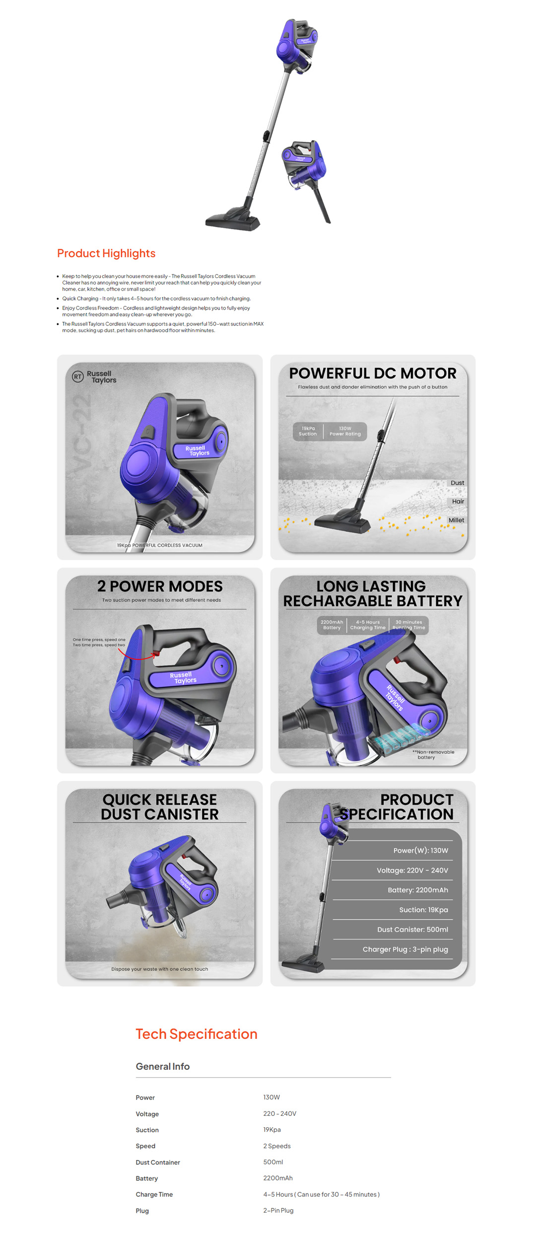 Russell Taylors 130W Cordless Vacuum Cleaner VC-22 | Powerful DC Motor | 2 Power Modes | Quick Release Dust Canister | Vacuum with 2 Year Warranty