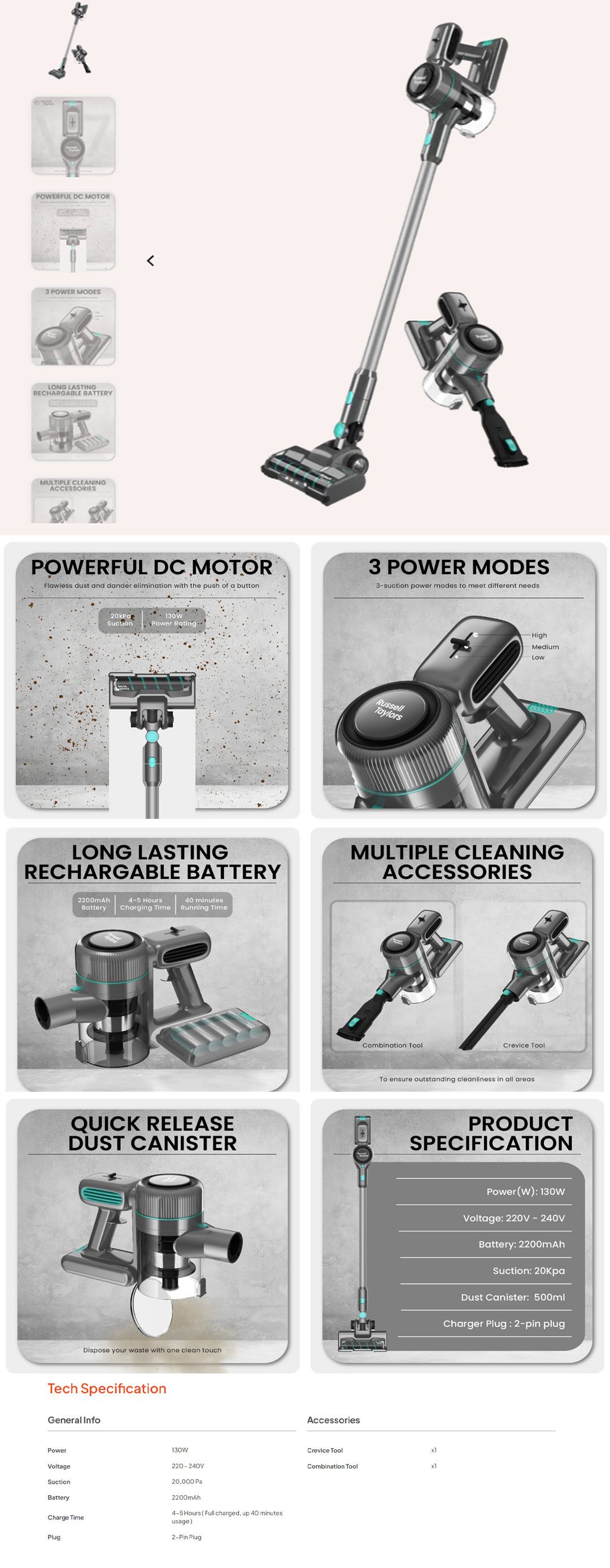 Russell Taylors 130W Cyclone Cordless Vacuum Cleaner V7 | Rechargable Battery | 3 Power Mode | Powerful DC Motor | Vacuum Cleaner with 2 Year Warranty