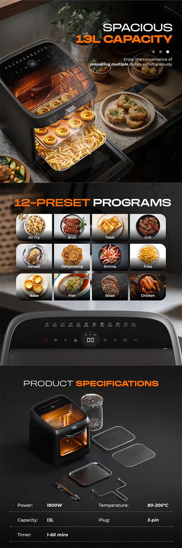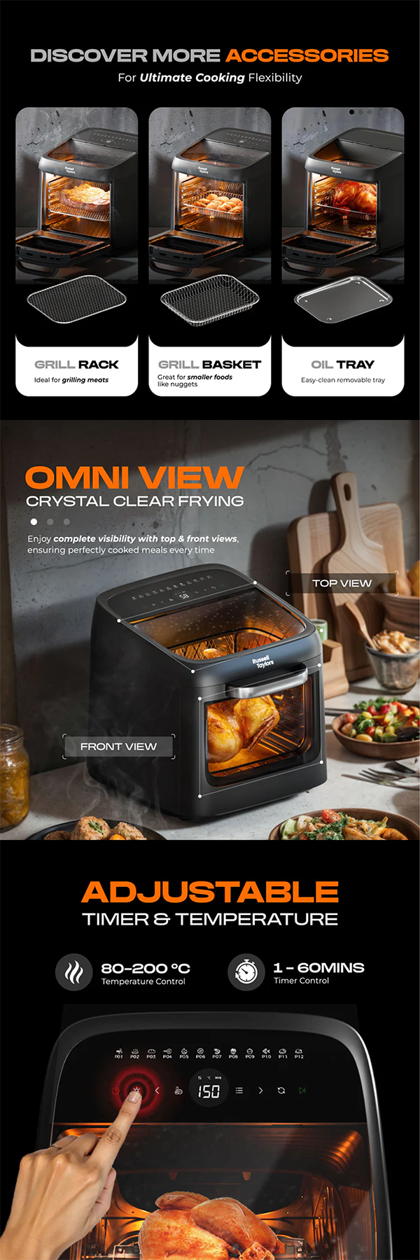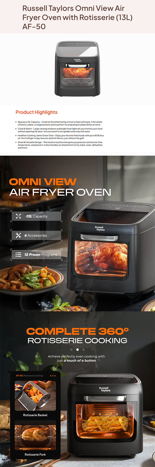 Russell Taylors 13L Omni View Air Fryer Oven with Rotisserie AF-50 | 1800W | Digital Touch Screen | 12 preset cooking programmes