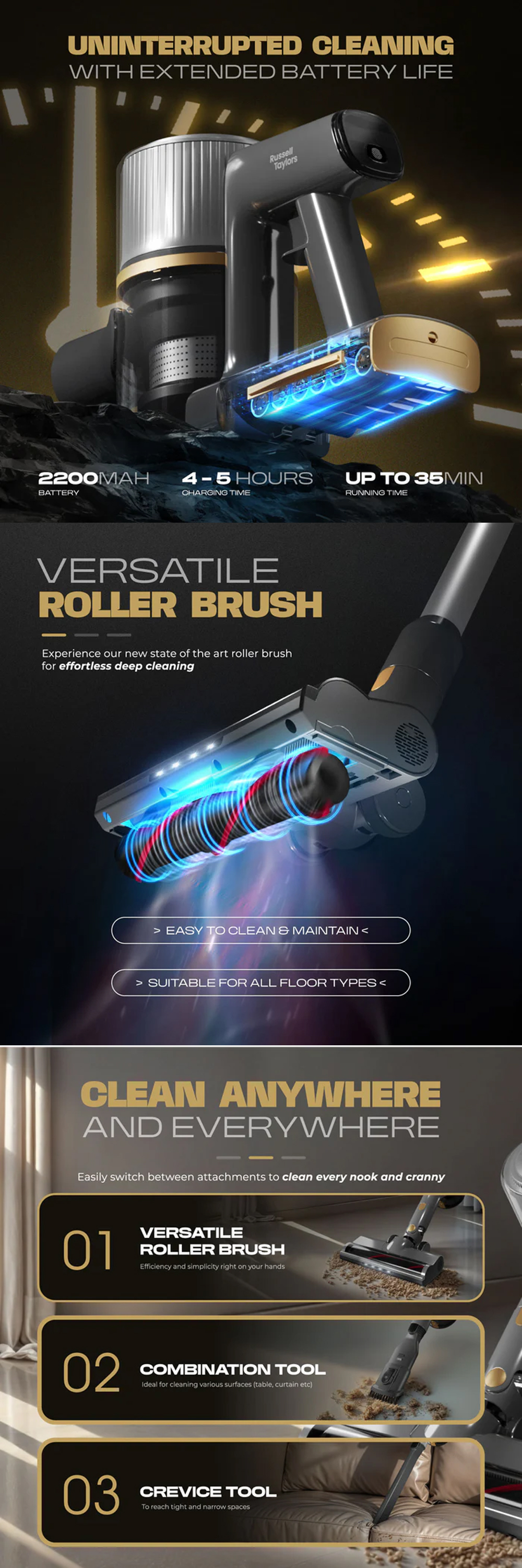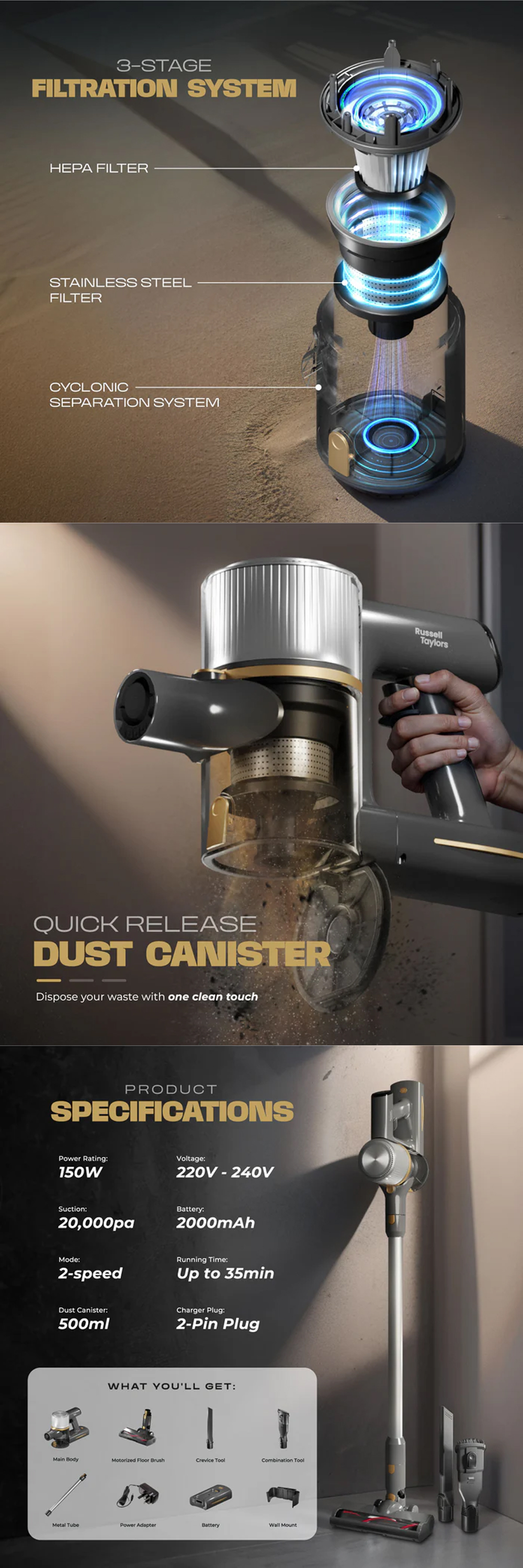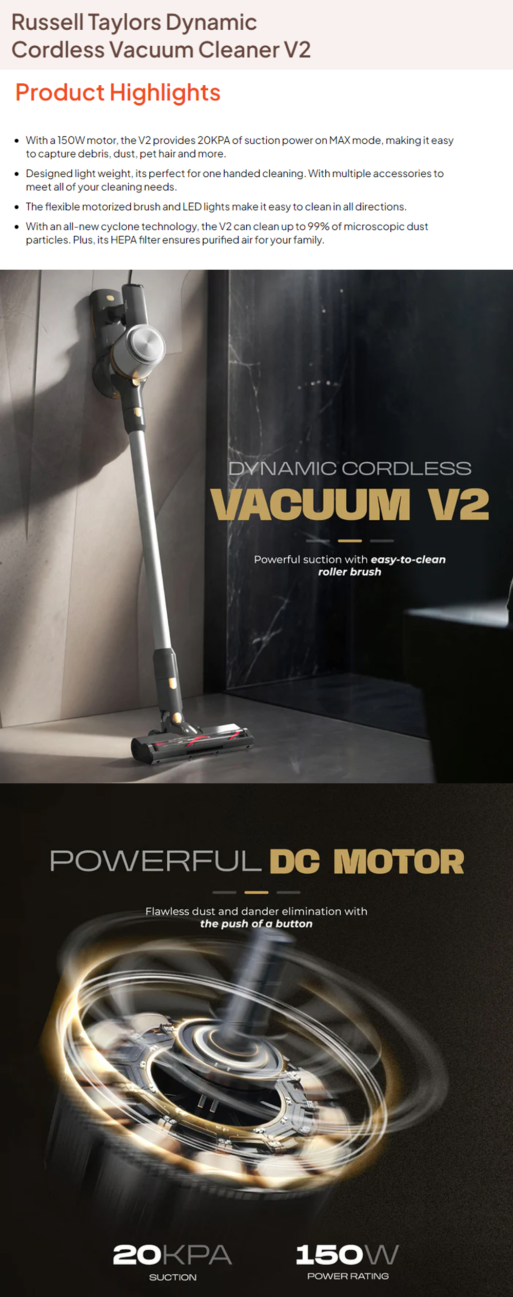 Russell Taylors 150W Dynamic Cordless Vacuum Cleaner V2 | Powerful DC Motor | 2-Speeds | Cyclonic Filtration System