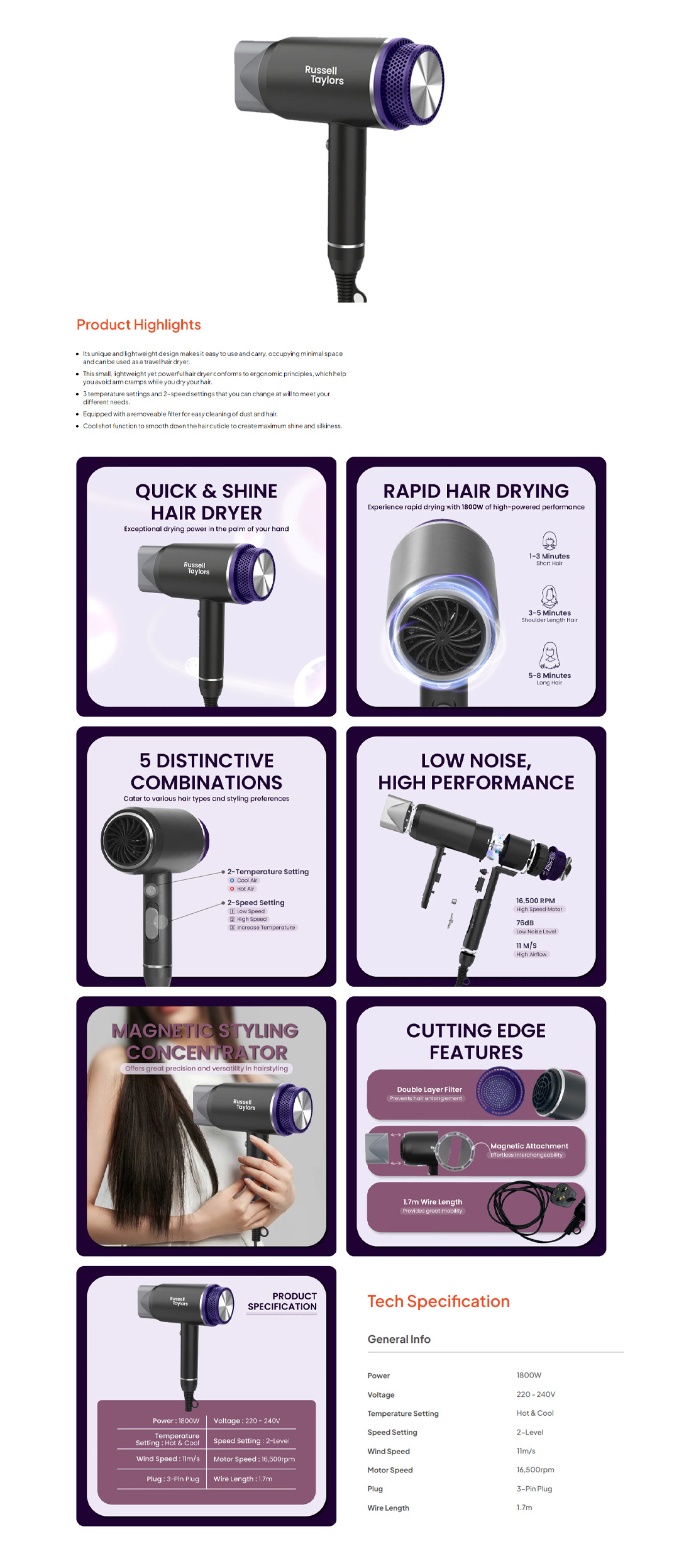 Russell Taylors 1800W Quick & Shine Hair Dryer HD2 | 3 Temperature Settings | Overheating Protection | 5 Distinctive Combinations | Hair Dryer with 2 Year Warranty