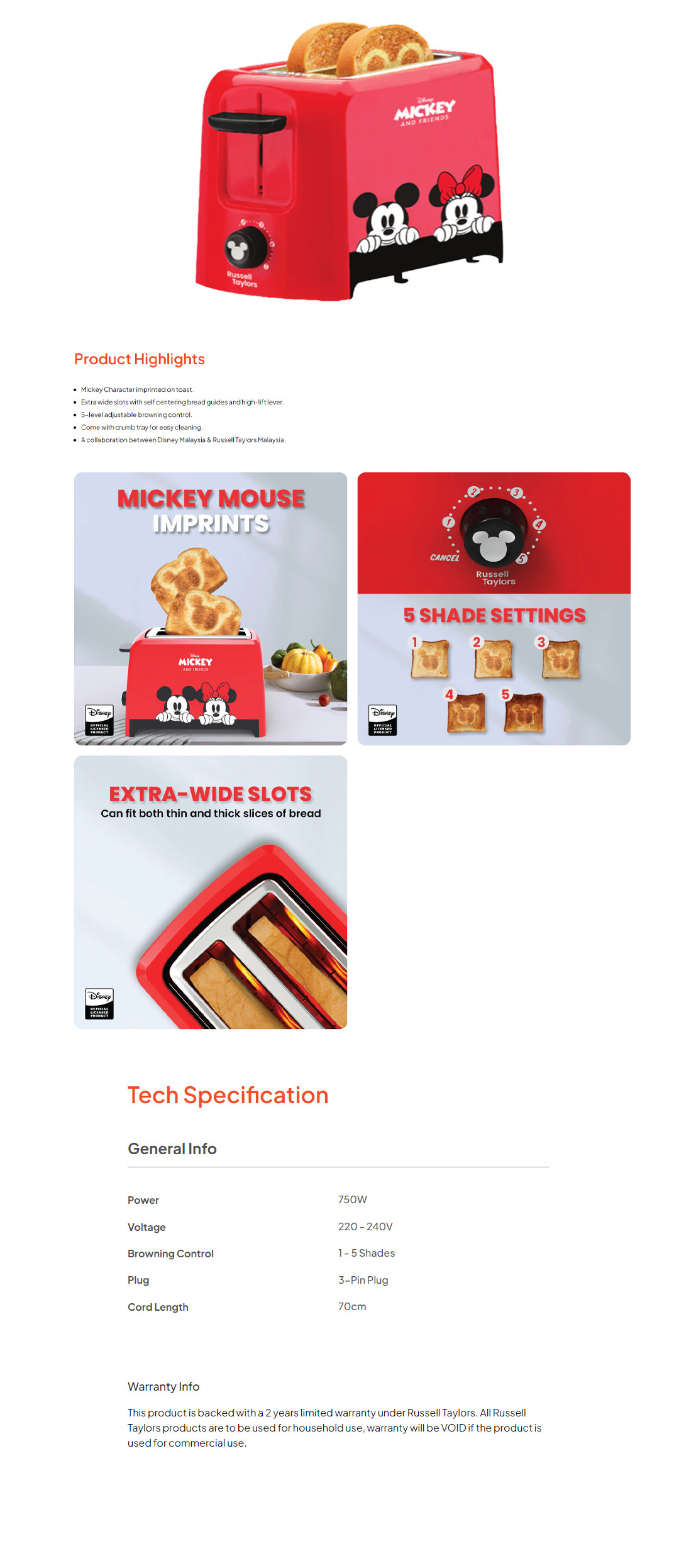Russell Taylors 2 Slices Disney Mickey And Friends Bread Toaster D3 | 750W Power | 5-Level Adjustable Browning Control | Extra Wide Slots | Toaster with 2 Year Warranty