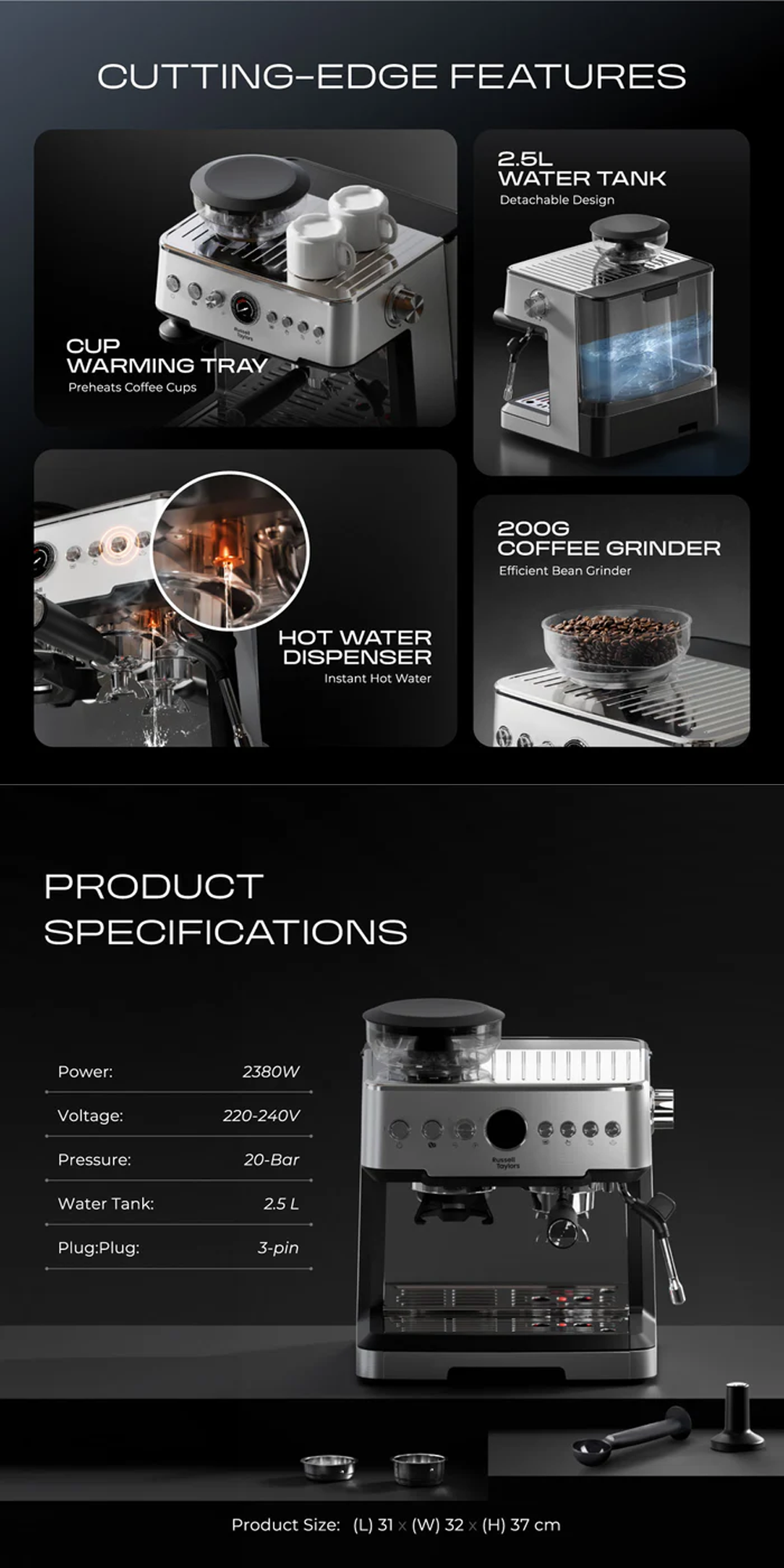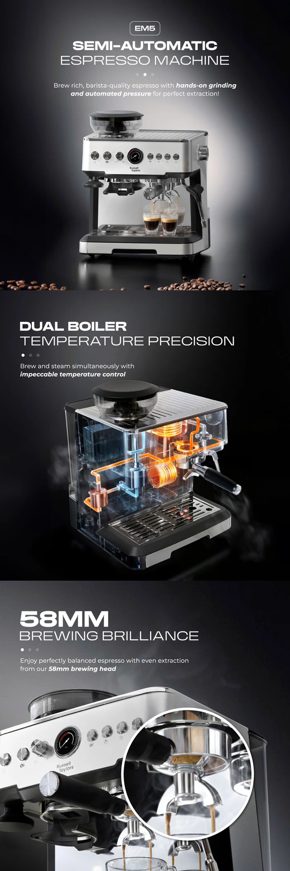 Russell Taylors 2380W 20 Bar Dual Boiler Espresso Machine 58mm Coffee Maker with Grinder EM5 | 200g Coffee Grinder | Dual Boiler | Powerful Steam