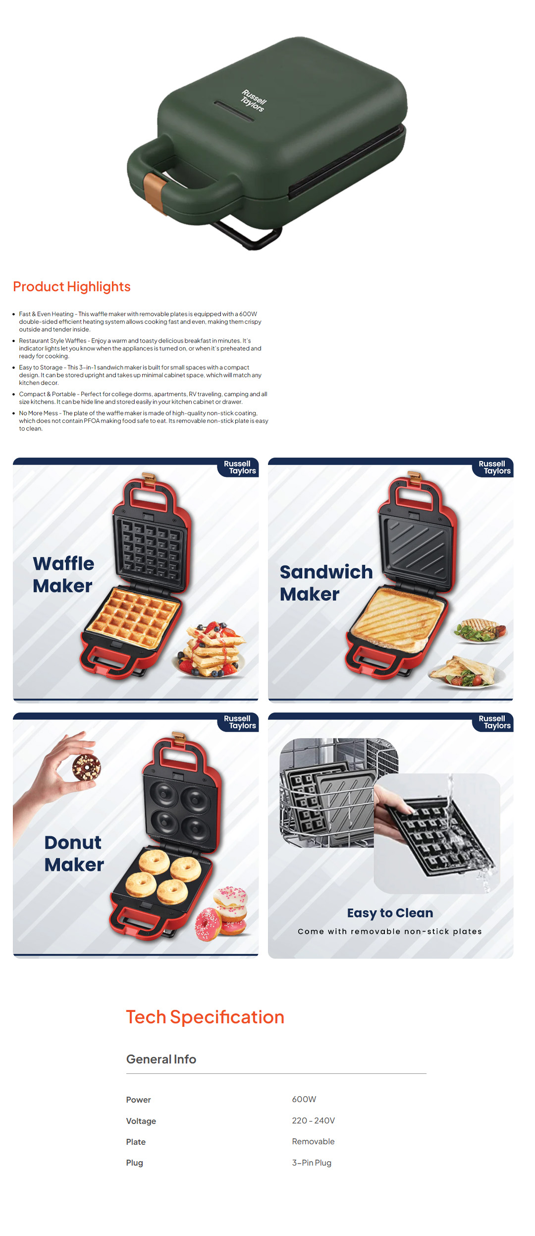 Russell Taylors 3-in-1 Waffle Sandwich & Doughnut Maker WM3 | 600W Power | Restaurant Style Waffles | Removable Plates | 3-in-1 Maker with 2 Year Warranty