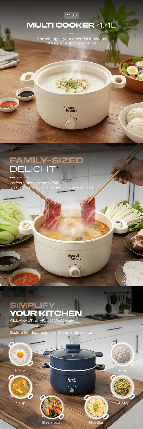 Russell Taylors 4.4L Multi Cooker with Steamer MC8 | 1000W | Compact Cooking Delight | Ceramic Non-Stick Coating