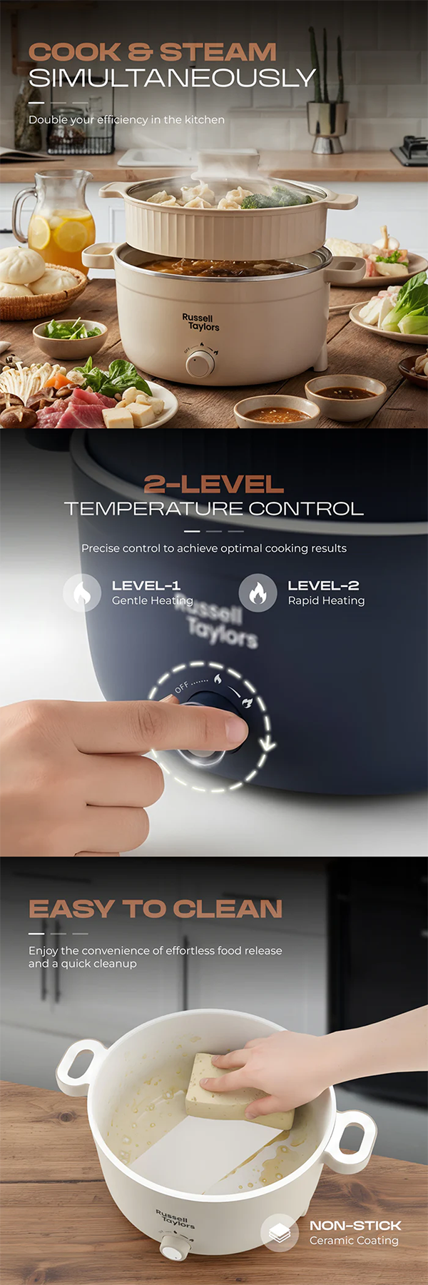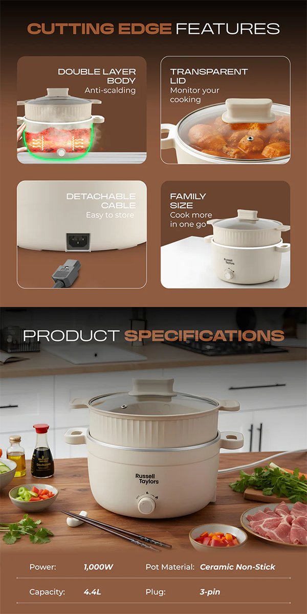 • Power : 1000W • Compact Cooking Delight : Perfect Size for Small Households & Individuals • All-In-One Multi Cooker • Cooks & Steam Simultaneously • 2 Level Temperature Control • Easy to Clean : Ceramic Non-Stick Coating • Double Layer Body : Anti-Scalding • Detachable Cable : Easy to Store • Transparent Lid : Monitor Your Cooking