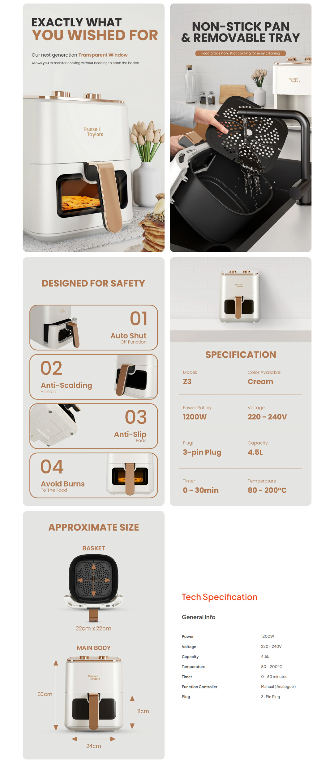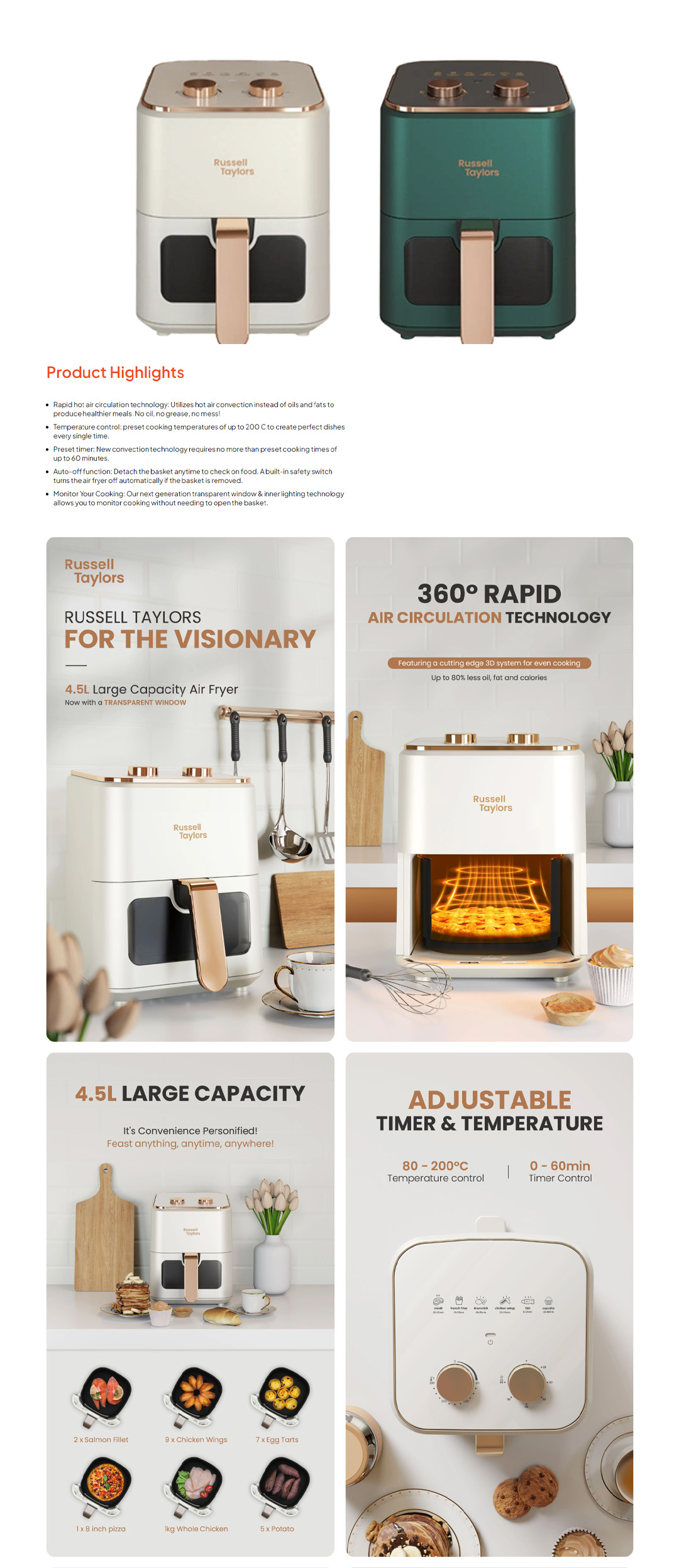 Russell Taylors 4.5L 3D Visible Window Air Fryer Z3 | 1200W Power | 360° Rapid Air Circulation Technology | Mechanical Control | Air Fryer with 2 Year Warranty