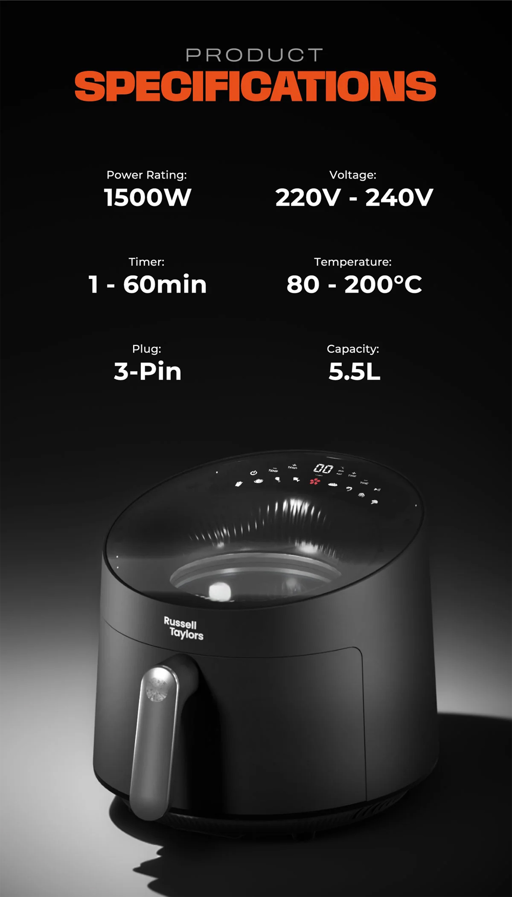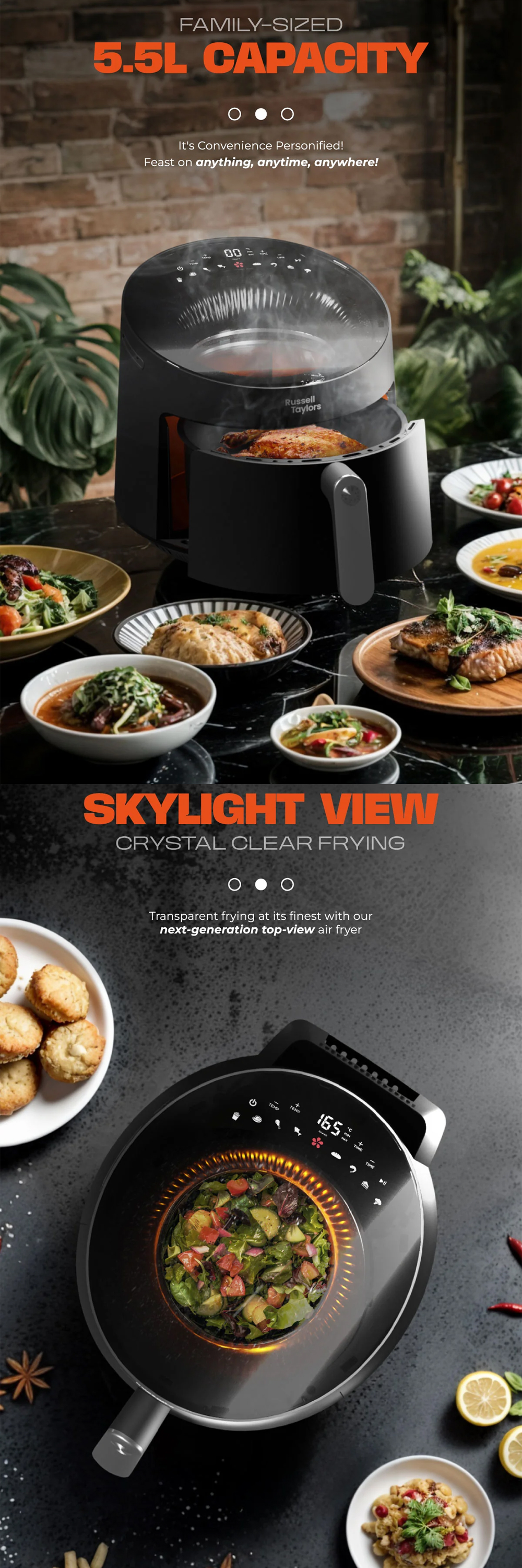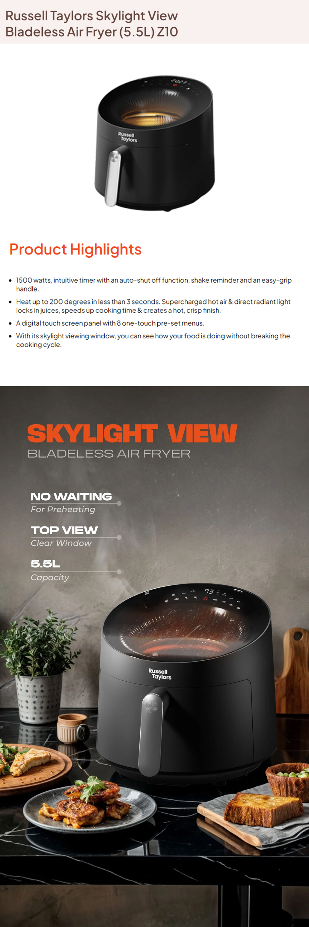 Russell Taylors 5.5L Skylight View Bladeless Air Fryer Z10 | Radiant Turbo Heating | Smart Preset Programs