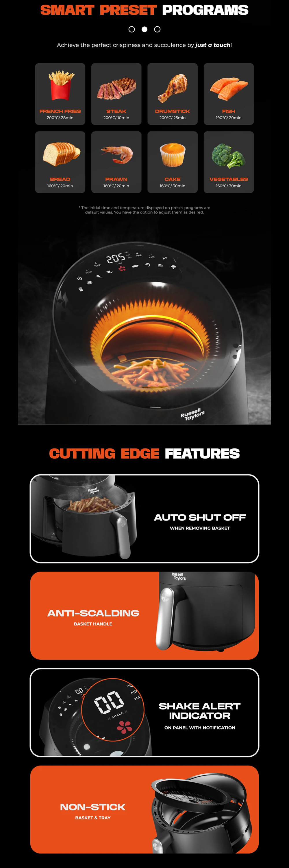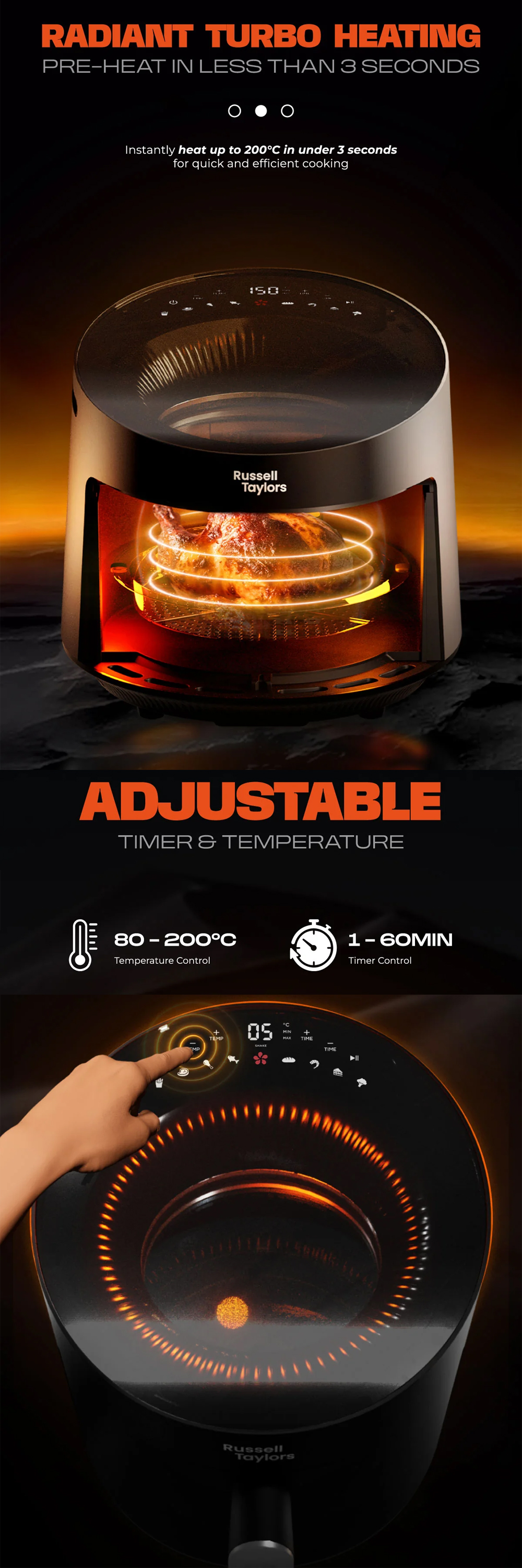 · Radiant Turbo Heating · Smart Preset Prograns · Auto Shut Off · Adjustable Timer & Temperature