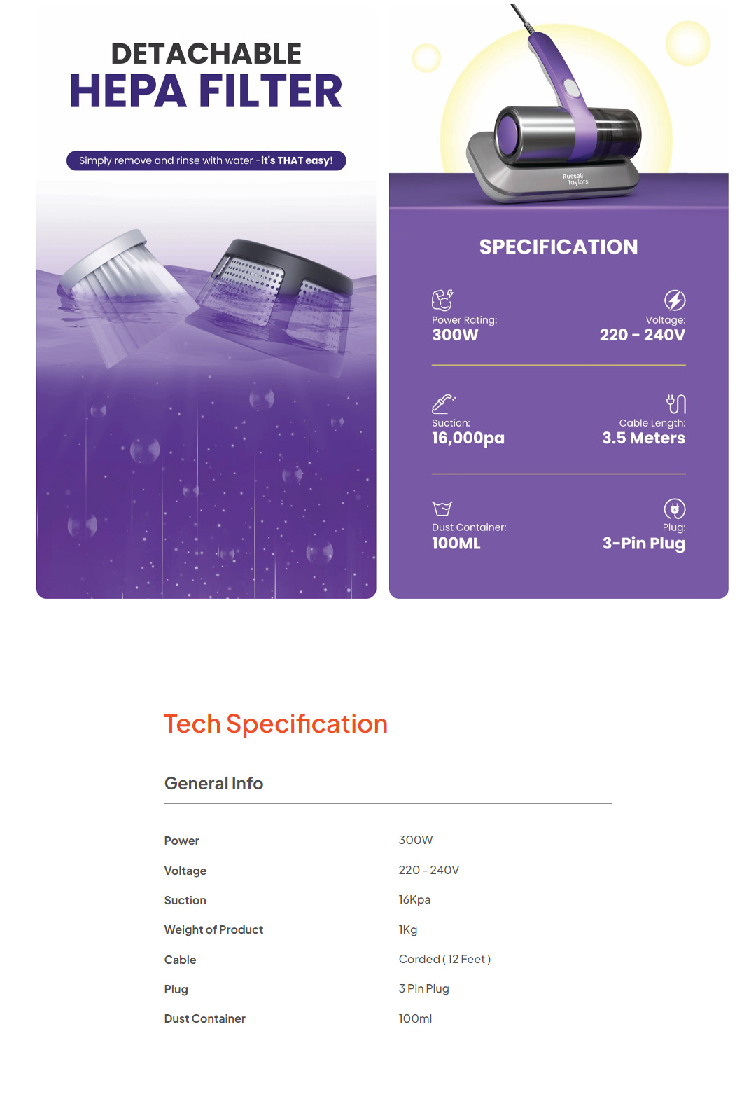 Russell Taylors 500W Dust Mite Vacuum Cleaner VM-10 | Multi-Layer Filtering System | Easy Waste Disposal | 16kpa Powerful Suction | Vacuum with 2 Year Warranty