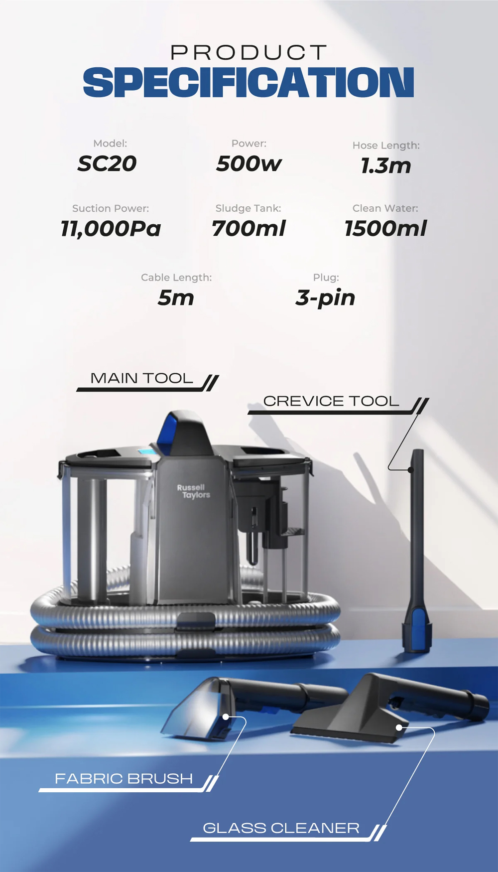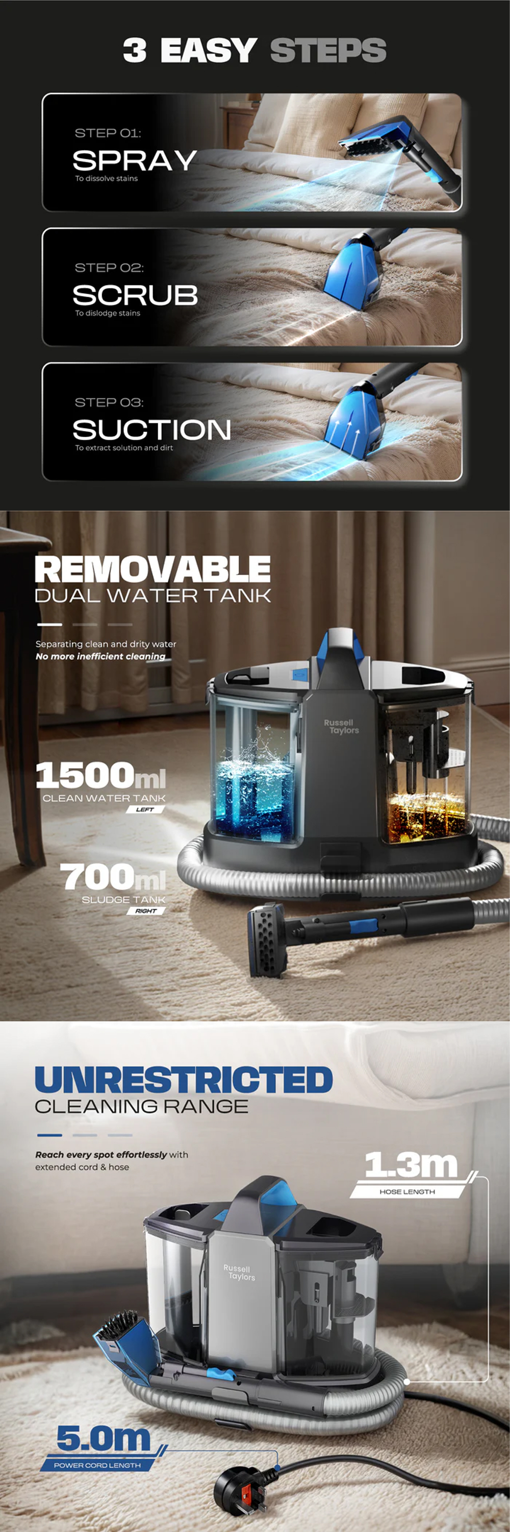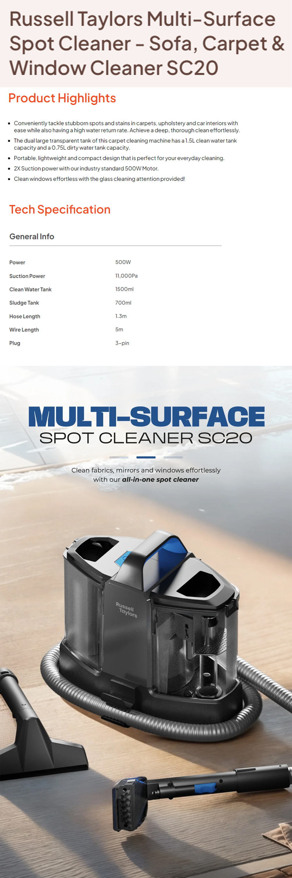 Russell Taylors 500W Multi-Surface Spot Cleaner SC20 | Clean fabrics, mirrors & windows | Portable, lightweight