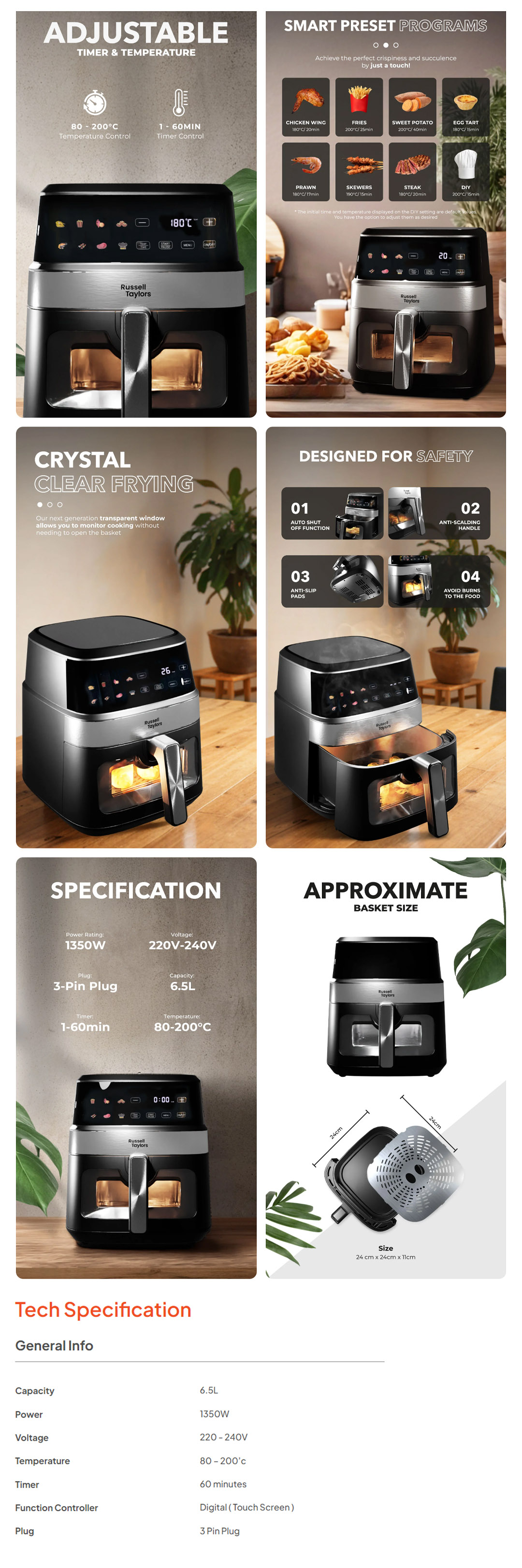 Russell Taylors 6.5L Visible Window Digital Air Fryer Z7 | Power Rating 1350 W | Crystal Clear Frying | Adjustable Timer & Temperature | Air Fryer with 2 Year Warranty