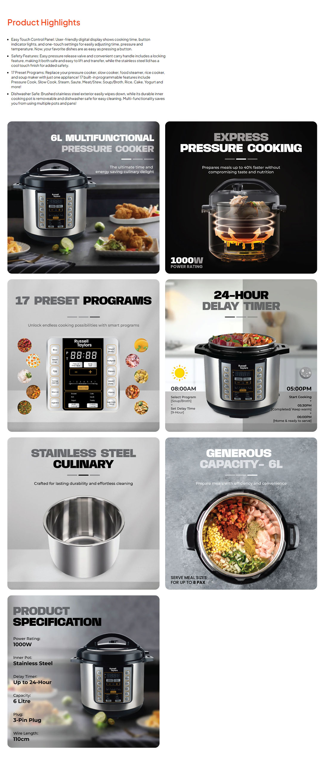 Russell Taylors 6L Electric Pressure Cooker 17 Preset Programs PC6 | 24-Hour Delay Timer | Express Cooking | Stainless Steel Culinary | Pressure Cooker with 2 Years Warranty