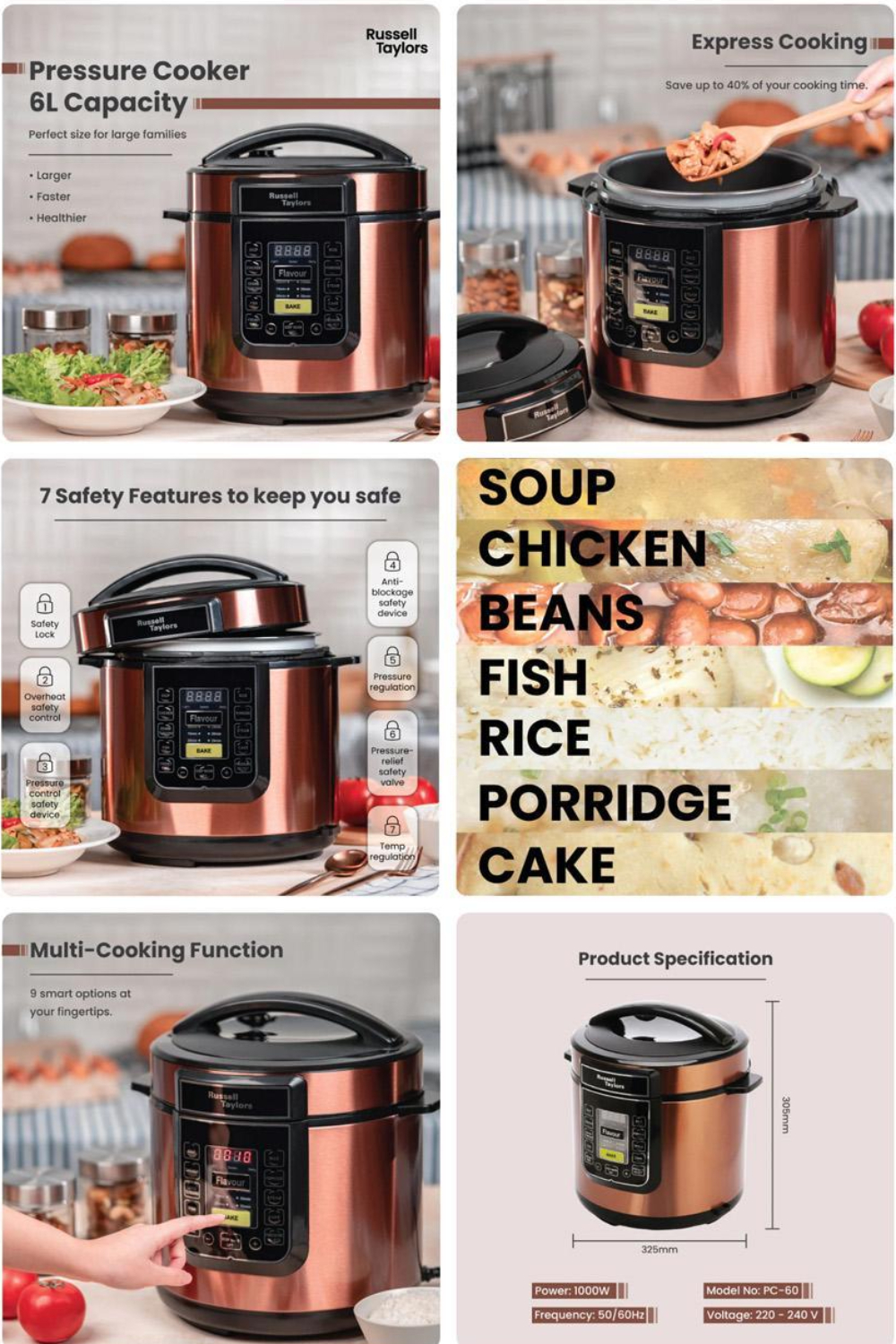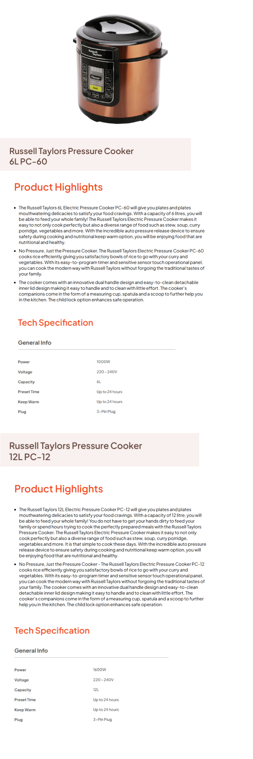 Russell Taylors 6L/12L Pressure Cooker PC-60/ PC-12 | Express Cooking | Multi-Cooking Function | LED Display | Cooker with 2 Year Warranty
