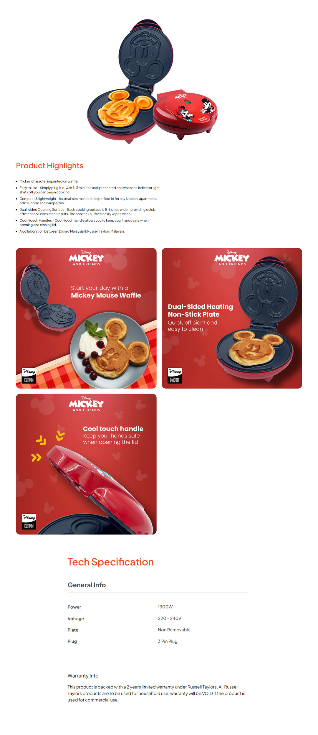 Russell Taylors Disney Mickey And Friends Waffle Maker D8 | 1200W Power | Non Stick Surface | Mickey Mouse Shaped Waffle | Waffle Maker with 2 Year Warranty
